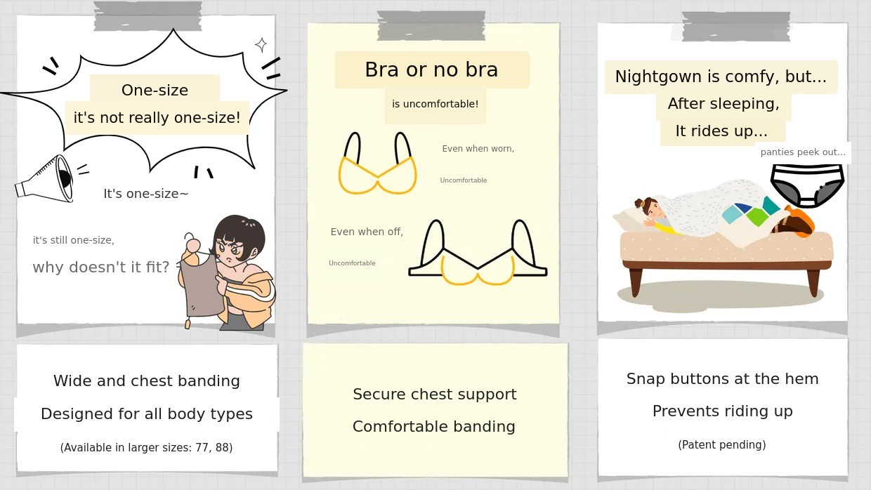 Nightdresses are easy to slip on and convenient since you only need to wear one piece. After a shower, you can wear it instead of a bathrobe and put on underwear once you’re fully dry. Despite many advantages, some people do not prefer nightdresses because ofthe critical flaw of nightdresses that 'ride up' This is likely the reason. 'Freezzy' thought hard about how to address this issue,'snap button' was the idea that came to mind.The snap button idea was entirely created by the 'Freezzy' maker, and this part is also patent pending.