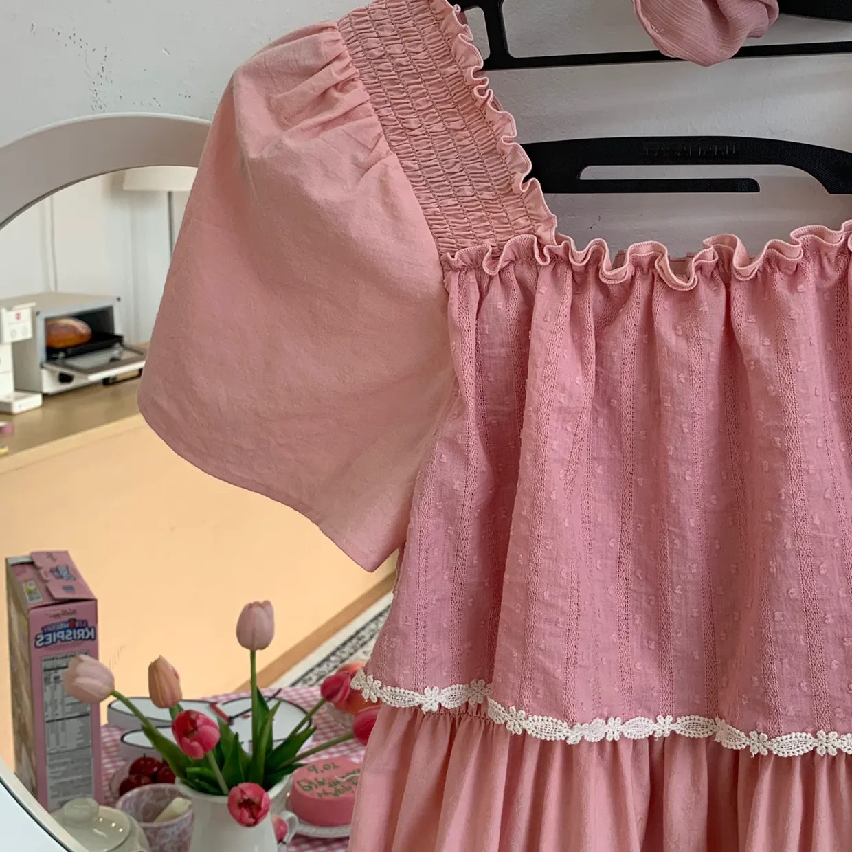From design to production, modeling, and photography, the maker personally handled everything to minimize labor costs and invest more in the clothing. We saved on every possible expense, such as delivery fees, and spared no investment in areas directly related to the value of the clothing, such as samples, patterns, and fabrics. This Freezzi was developed and refined through several samples, studying and adjusting the elasticity of the smocked band, the length, and the sleeve shape.