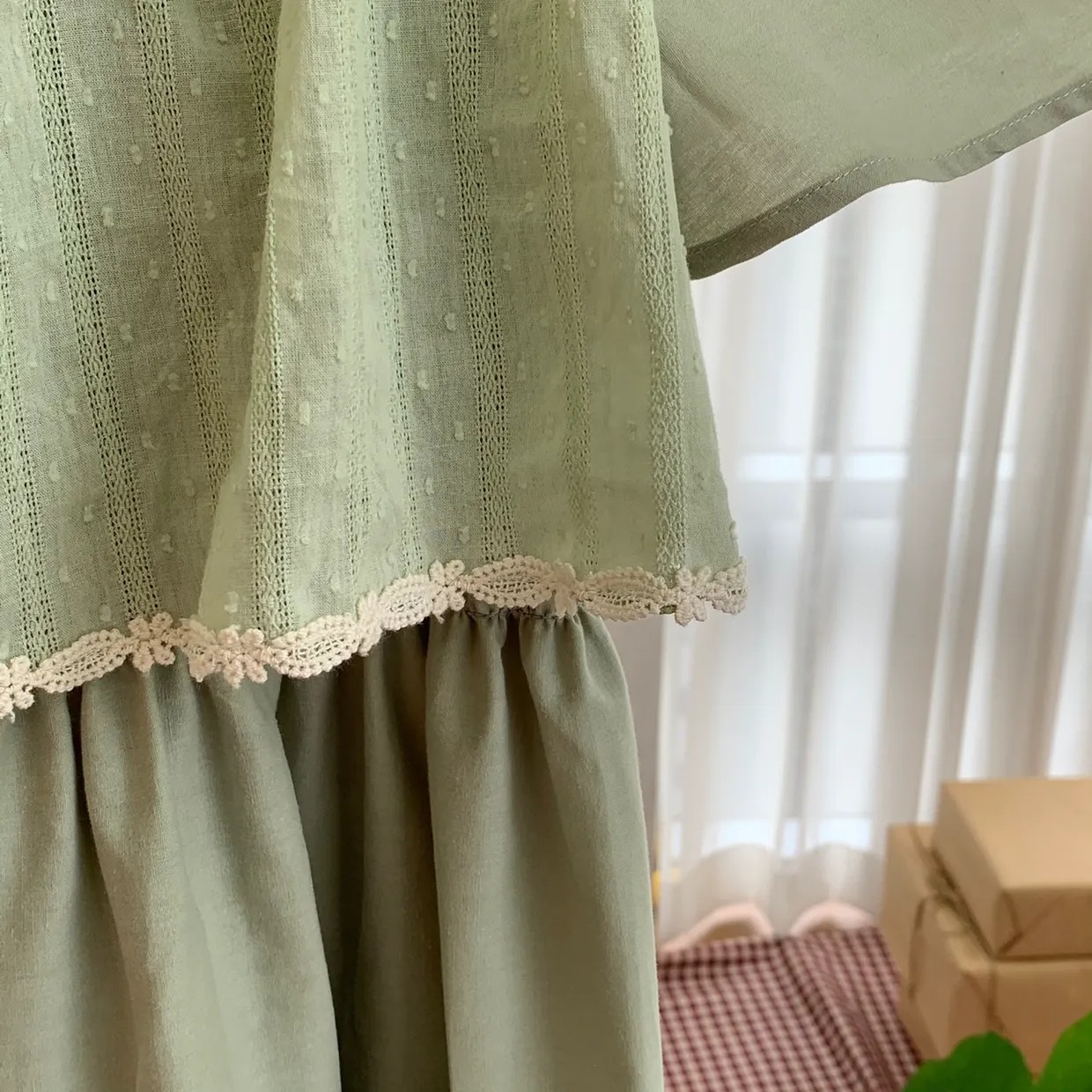 Unlike other nursing dresses, you don't need to unbutton one by one—just pull it down, which is very convenient.(Although it may not touch when pulled down) just in case there is any part that might touch the baby, we also used cotton fabric for the front part.