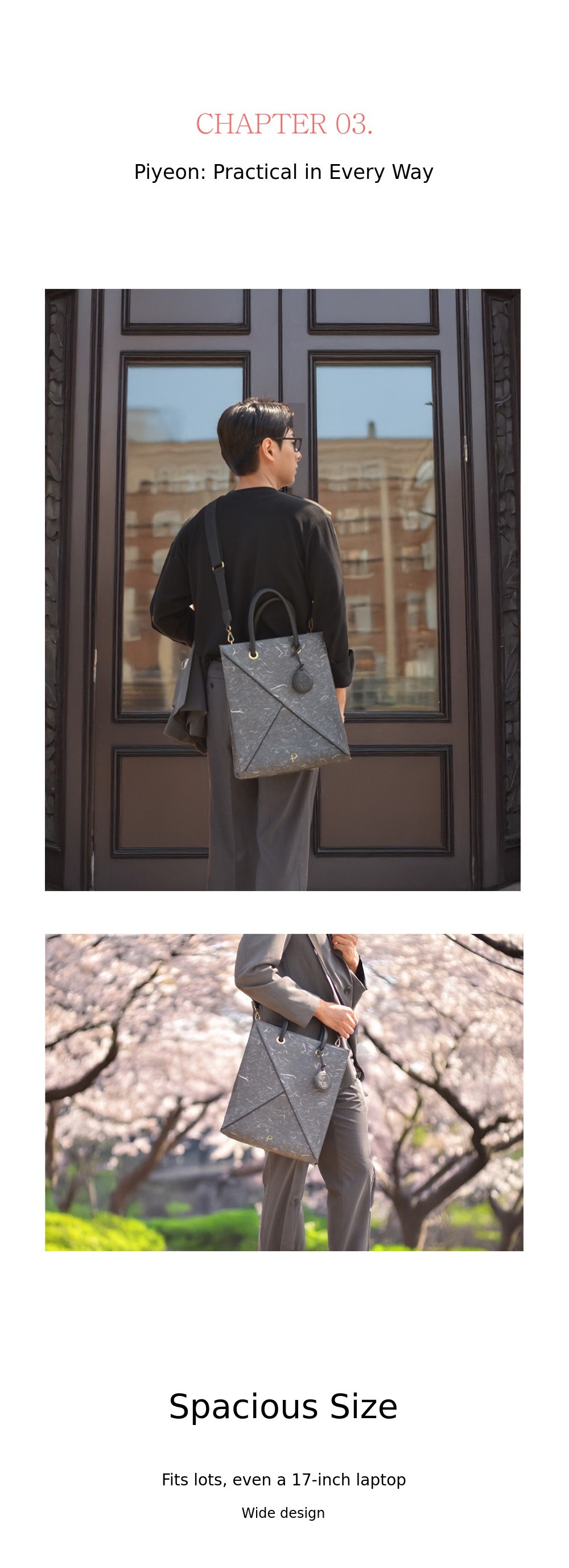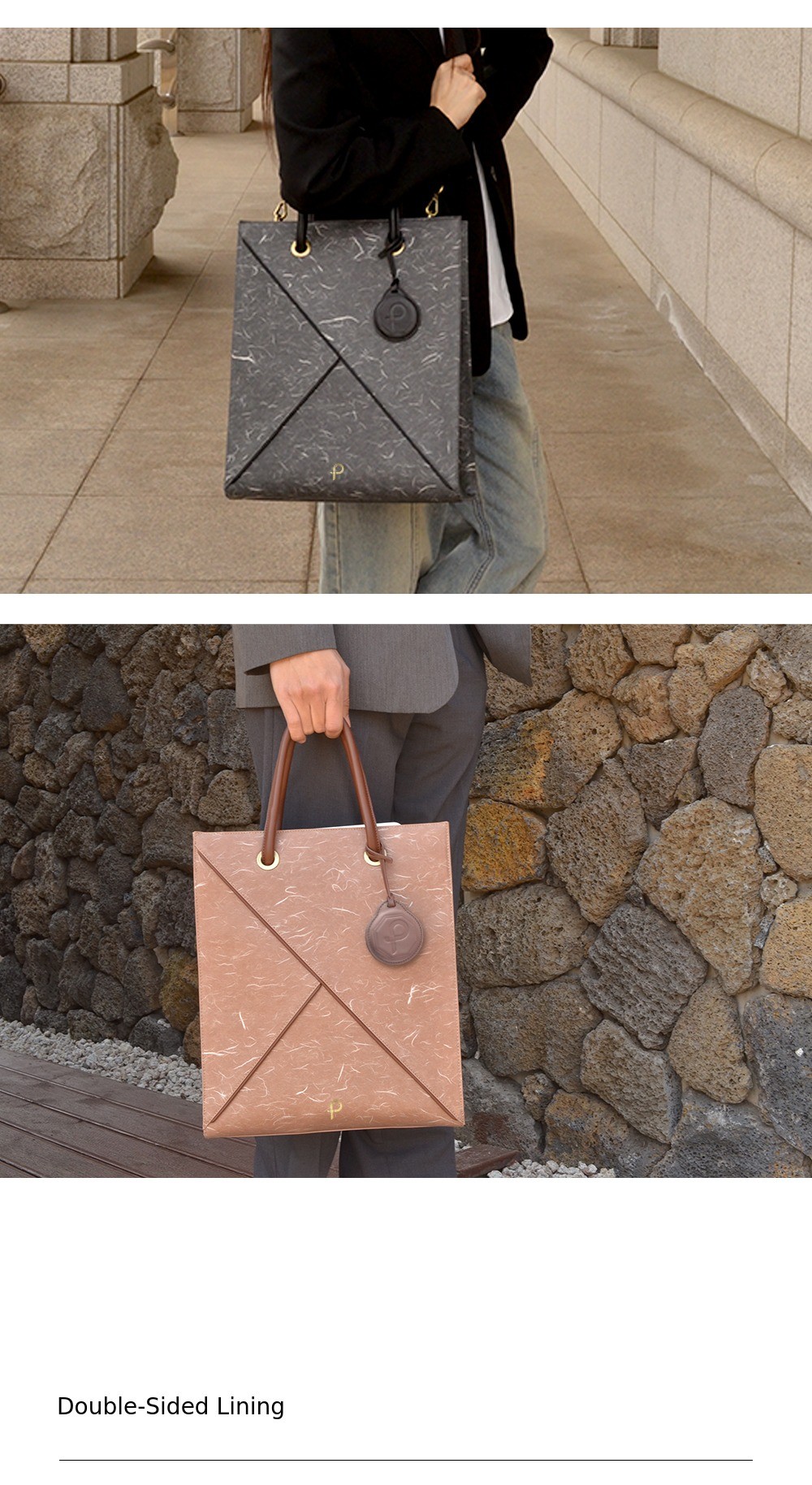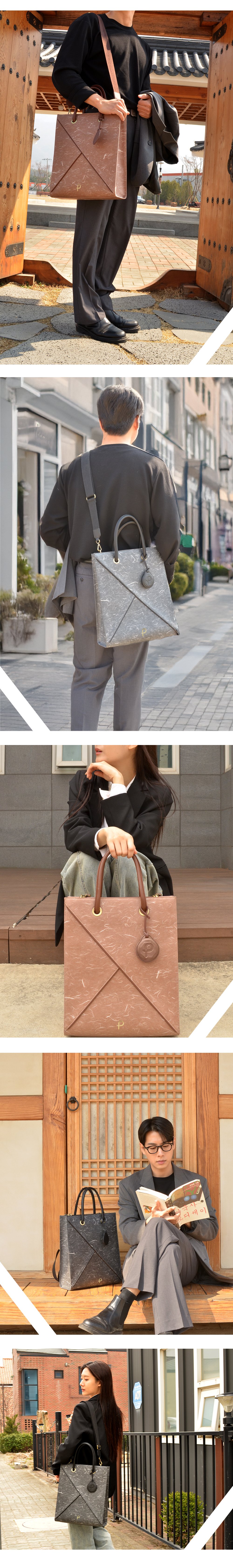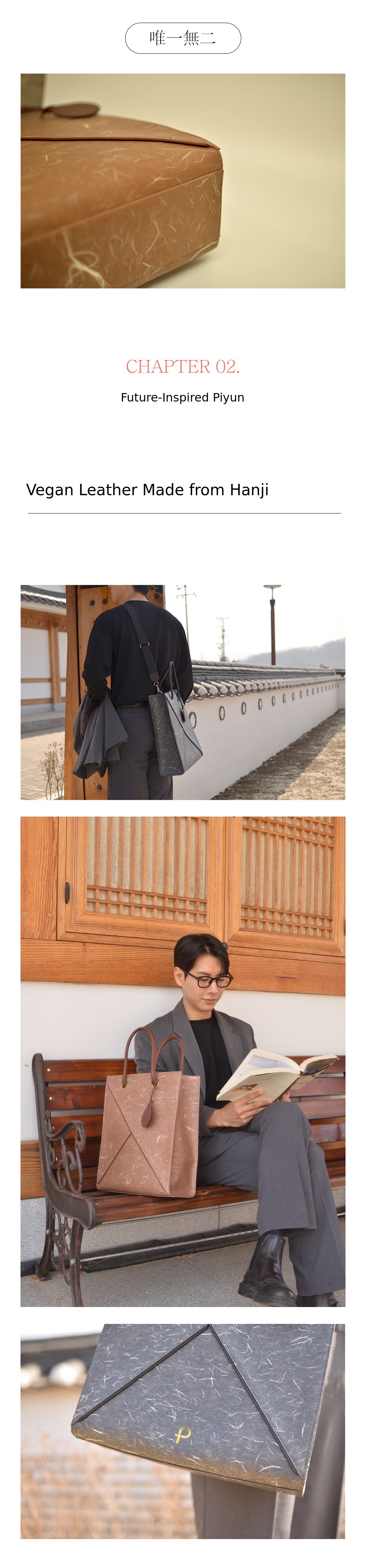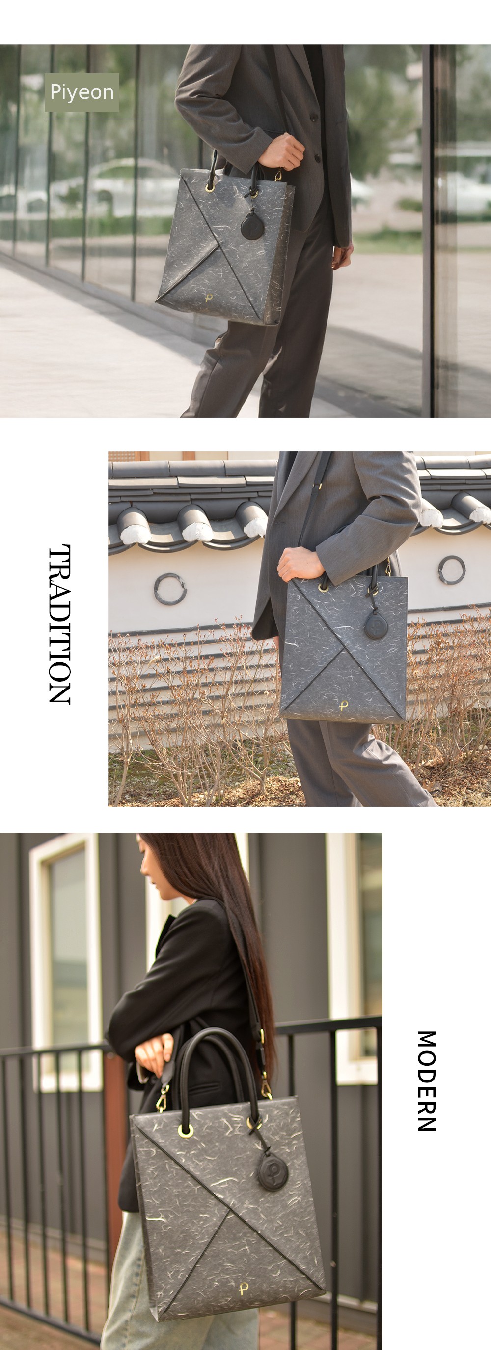 The vegan leather jeogori collar hanji tote bag is a work centered on [traditional elements] to 'express the beauty and elegance of tradition with a modern design sensibility' and [environment] for 'responsibility to the next generation.'