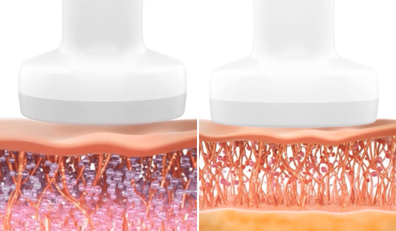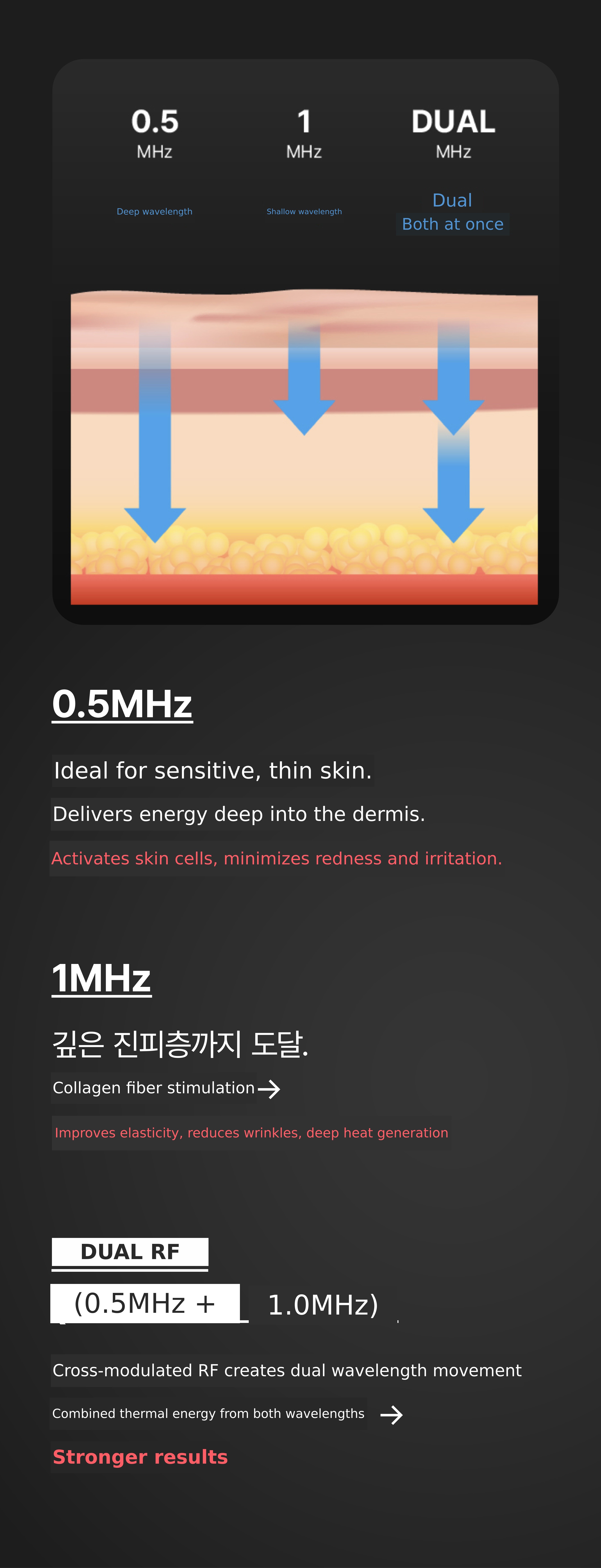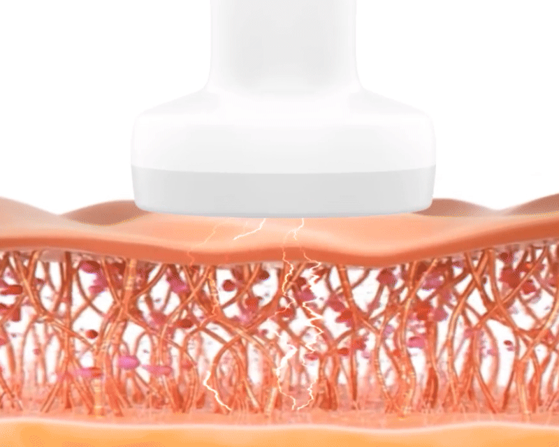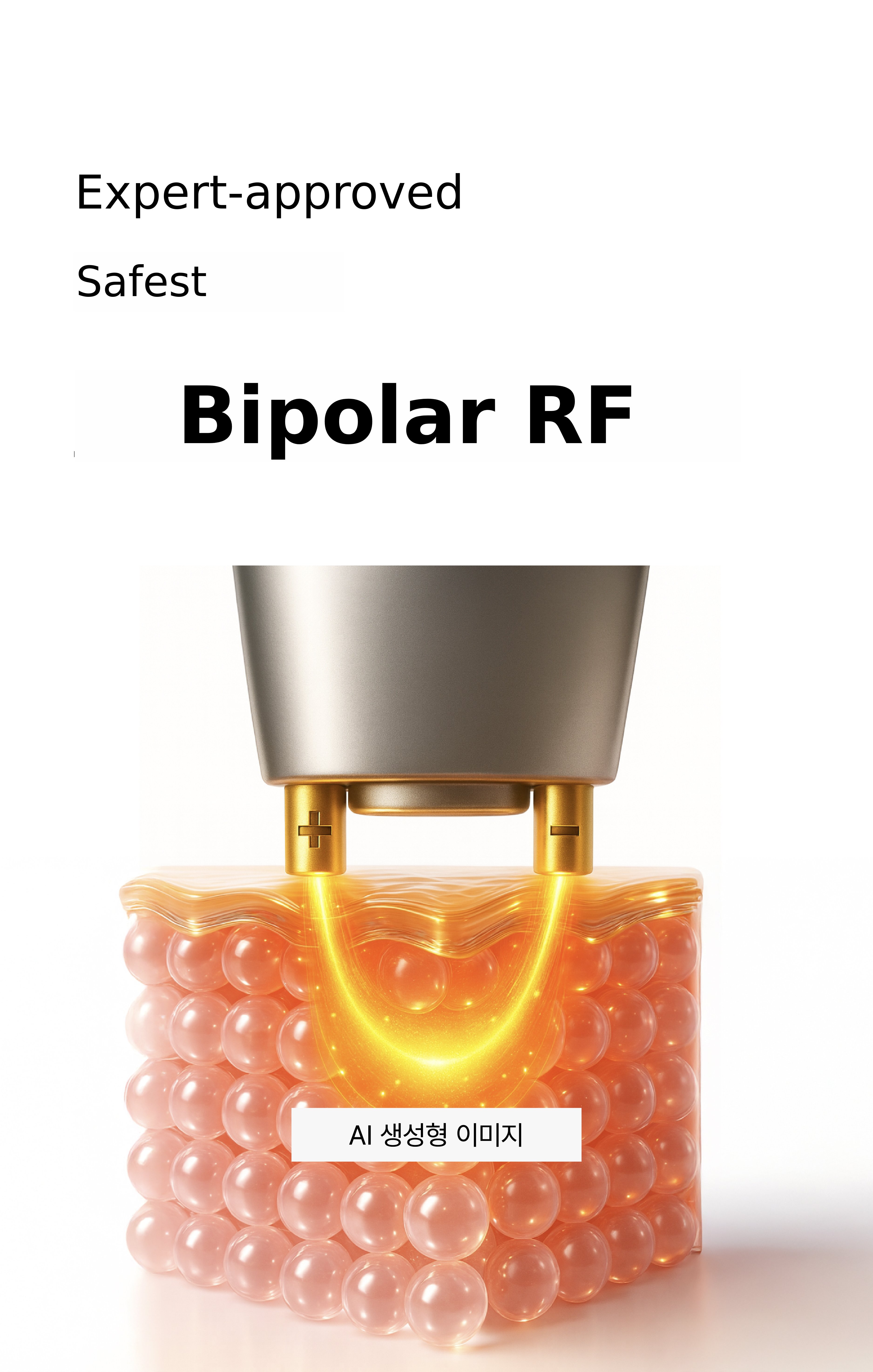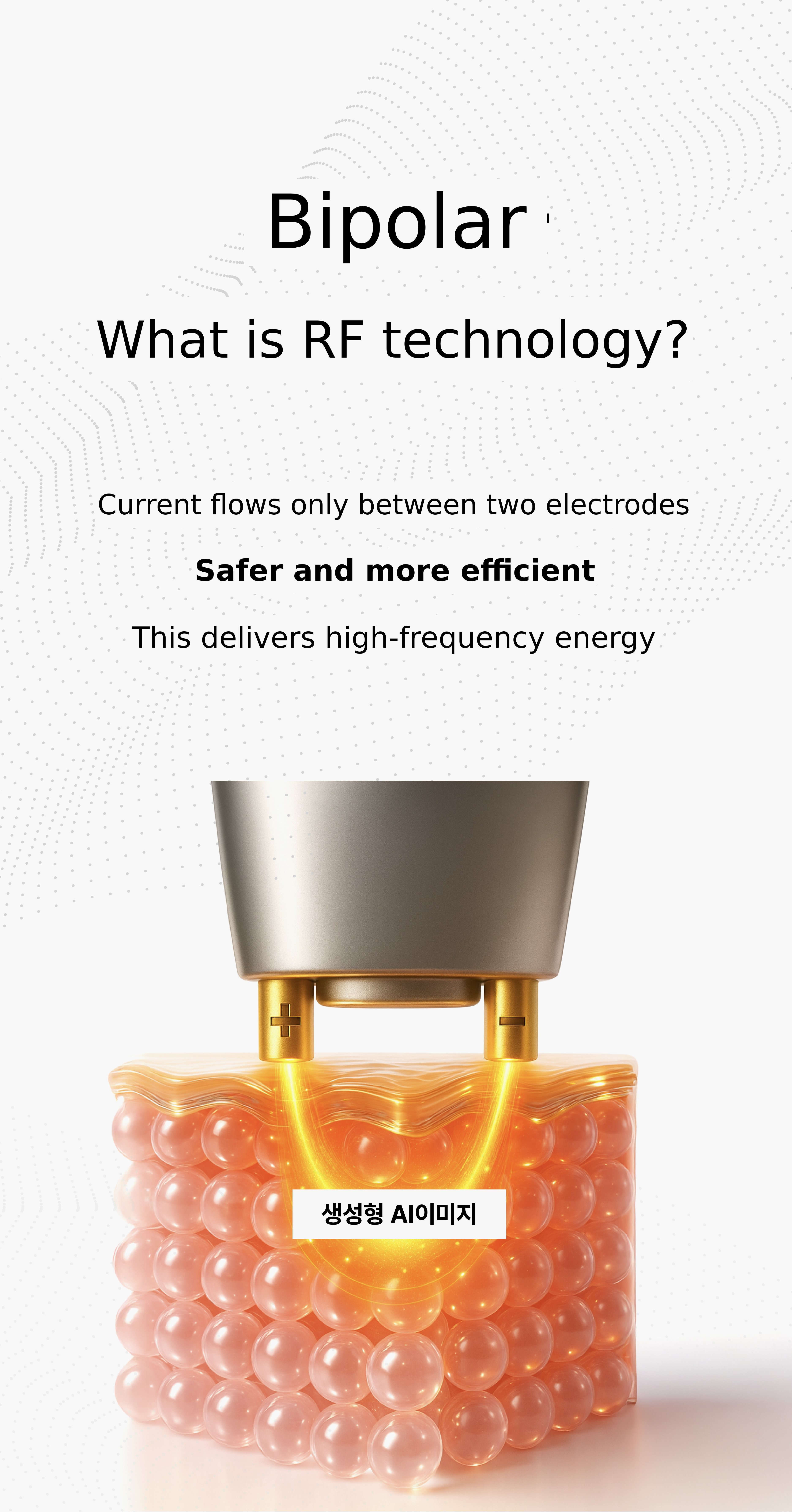Unlike other high frequencies,the bipolar method isdesigned so that current flows only between two electrodes. This methodlocalizes the area of energy delivery so thatthe stimulation to the skin is minimized while still allowinghigh-frequency energy to reach the dermis safely and accurately.
