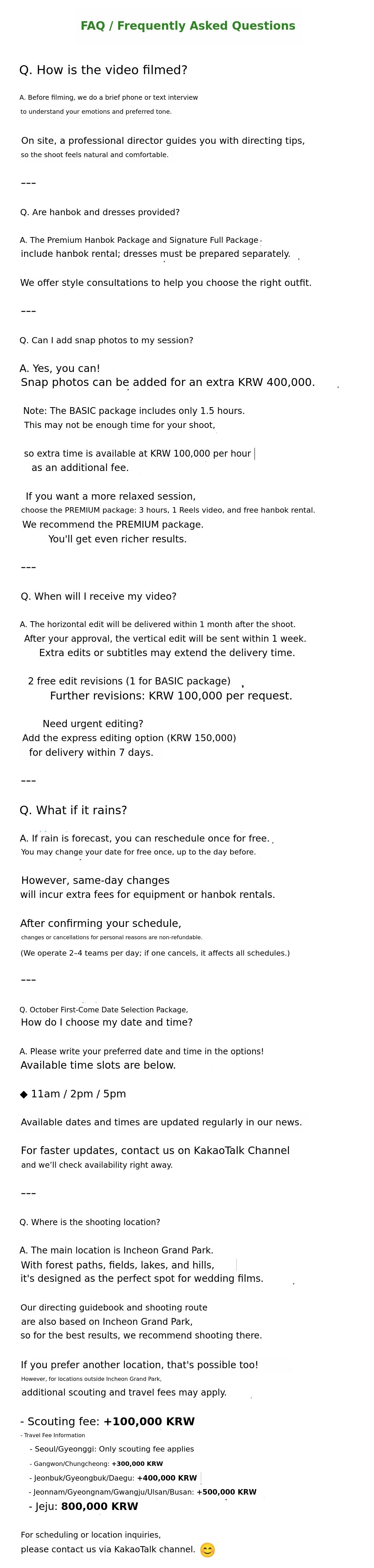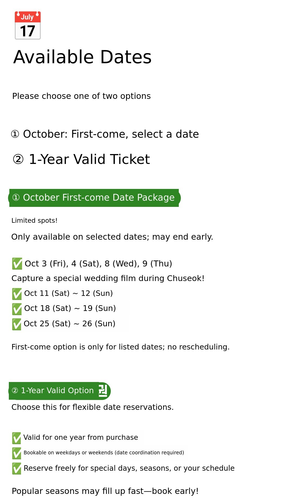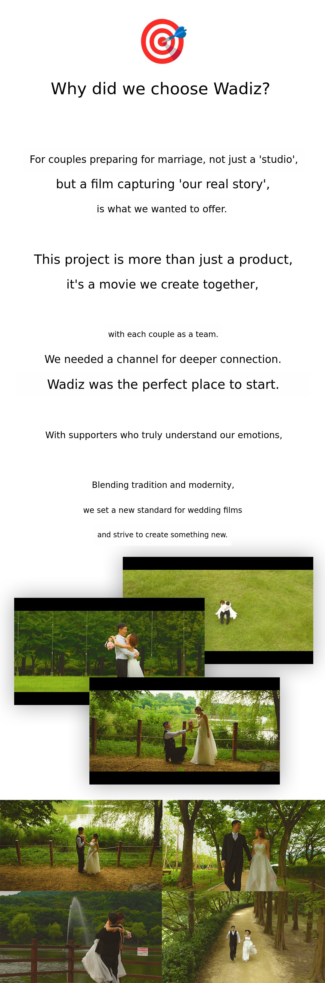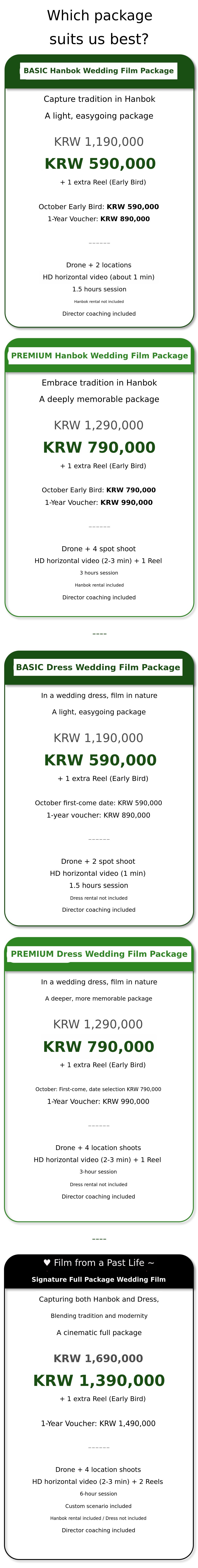 1. 🎥 Hanbok and Wedding Dress Film - Customized wedding film blending tradition and modernity 2. 🌿 Outdoor Natural Background - Emotional wedding videos shot in fields, forests, and lakes 3. 🎁 Early Bird Special Offer - Affordable pricing with exclusive discounts for supporters