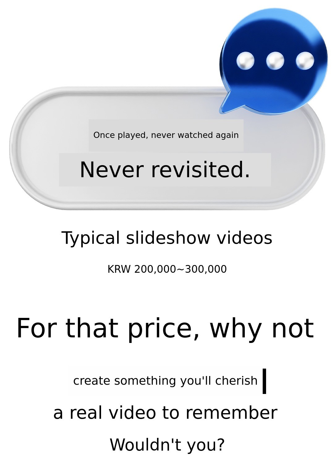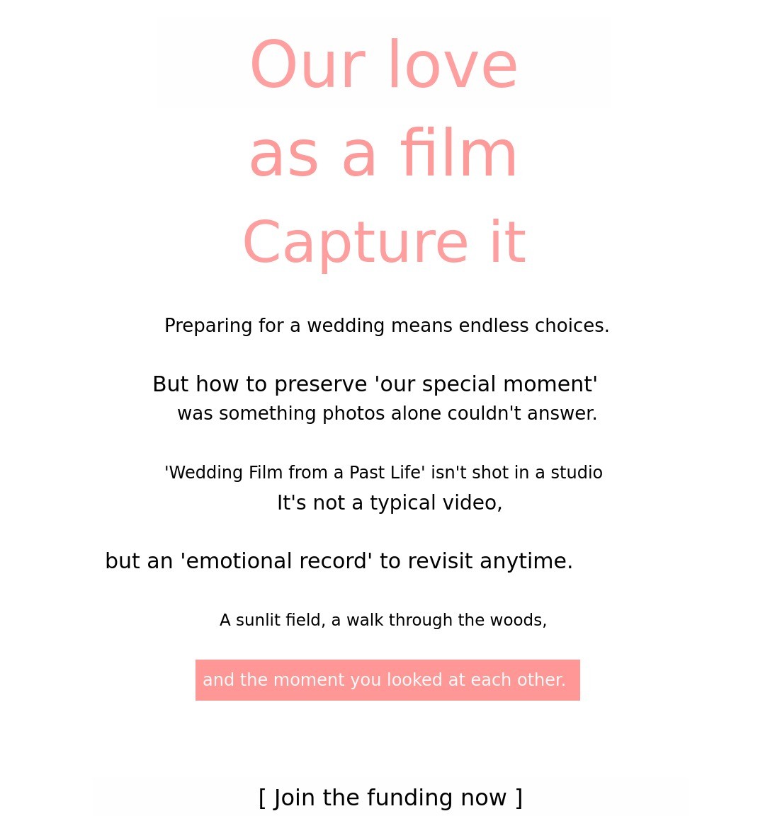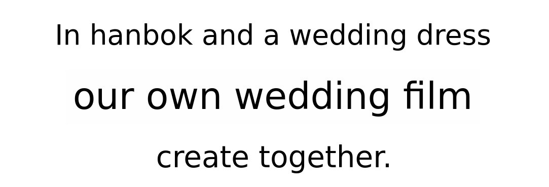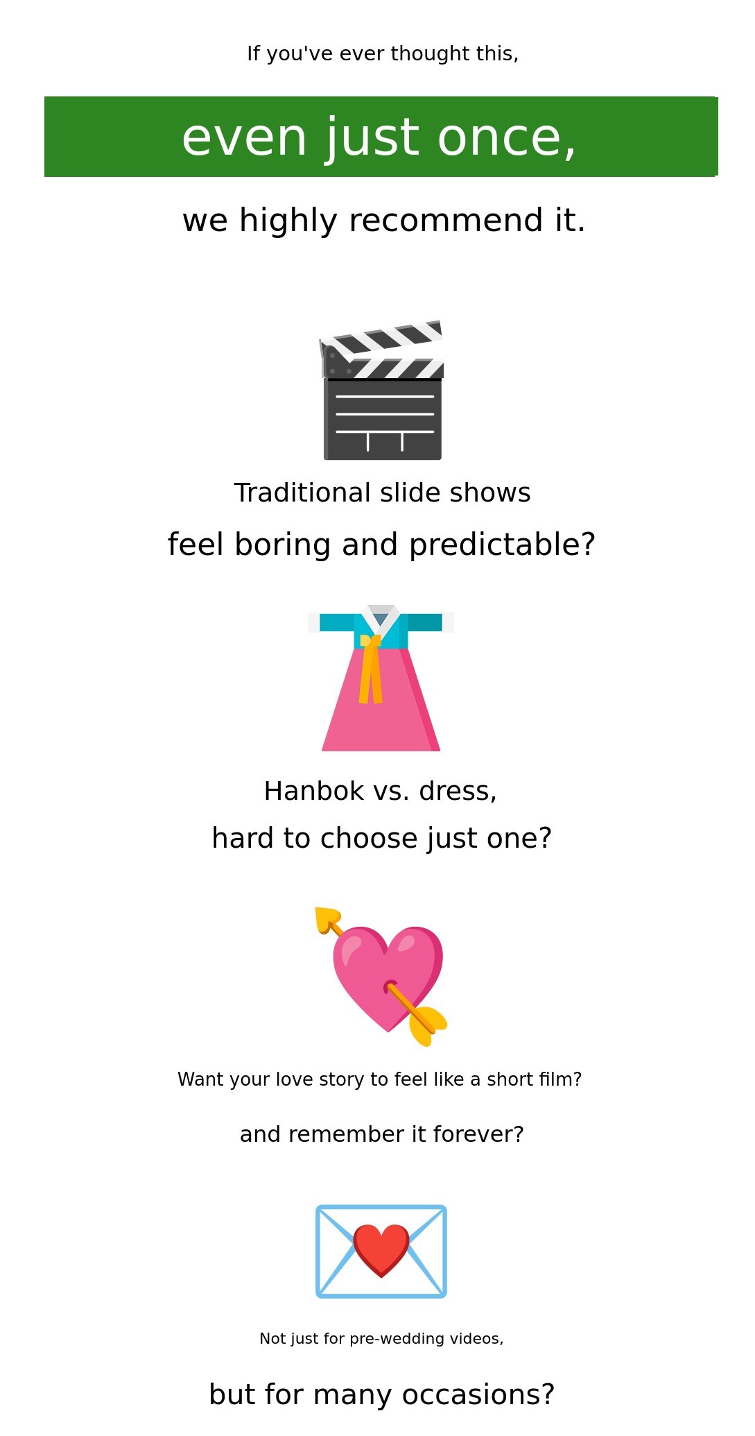 1. 🎥 Hanbok and Wedding Dress Film - Customized wedding film blending tradition and modernity 2. 🌿 Outdoor Natural Background - Emotional wedding videos shot in fields, forests, and lakes 3. 🎁 Early Bird Special Offer - Affordable pricing with exclusive discounts for supporters