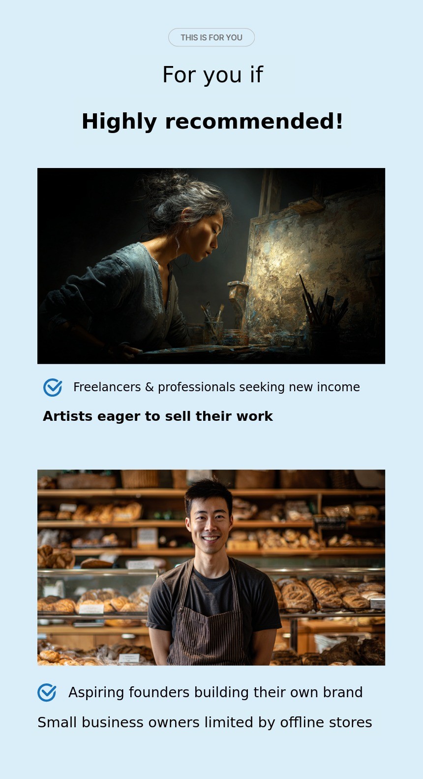 - Creators and small business owners who want to easily sell their products online