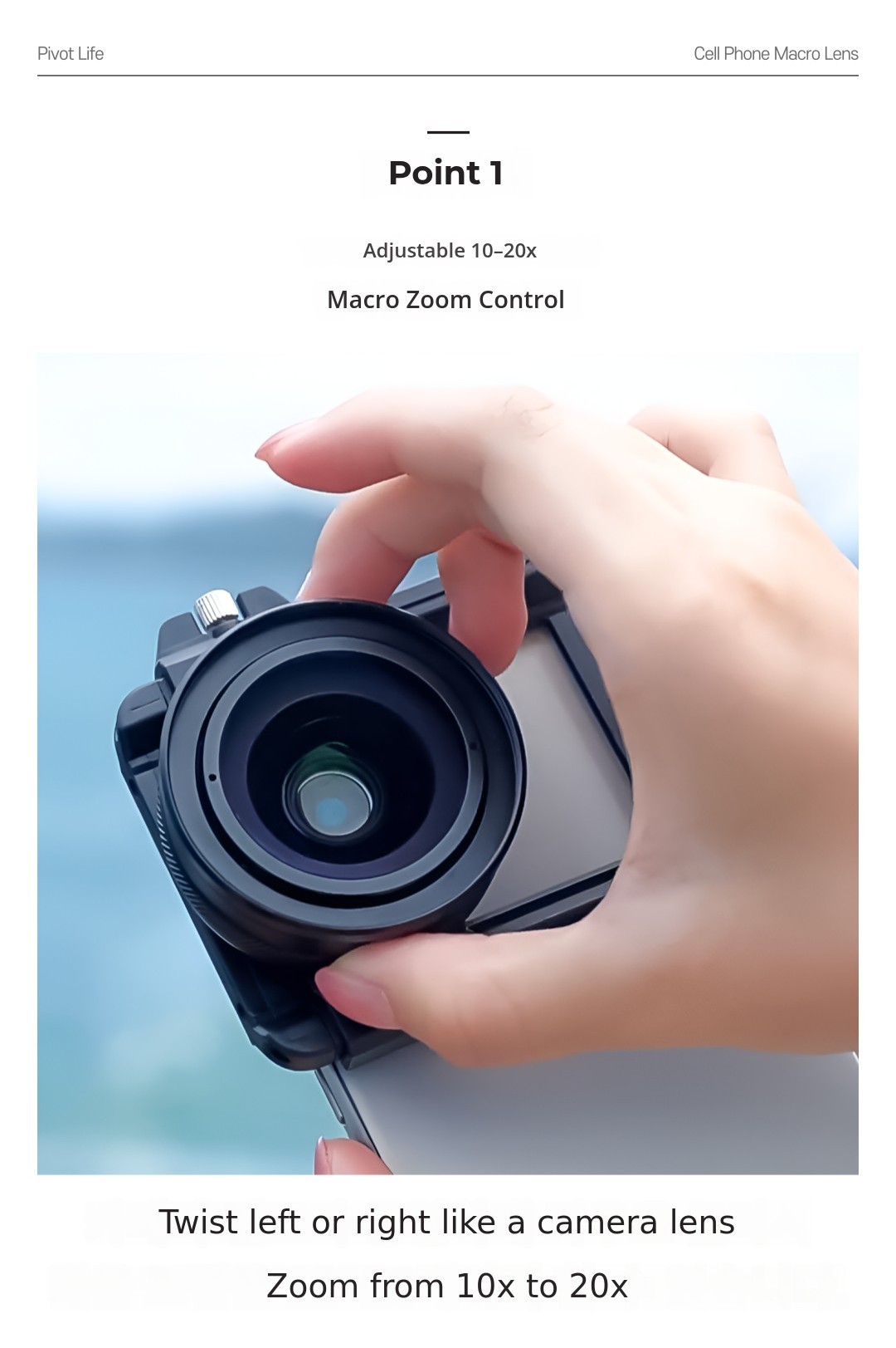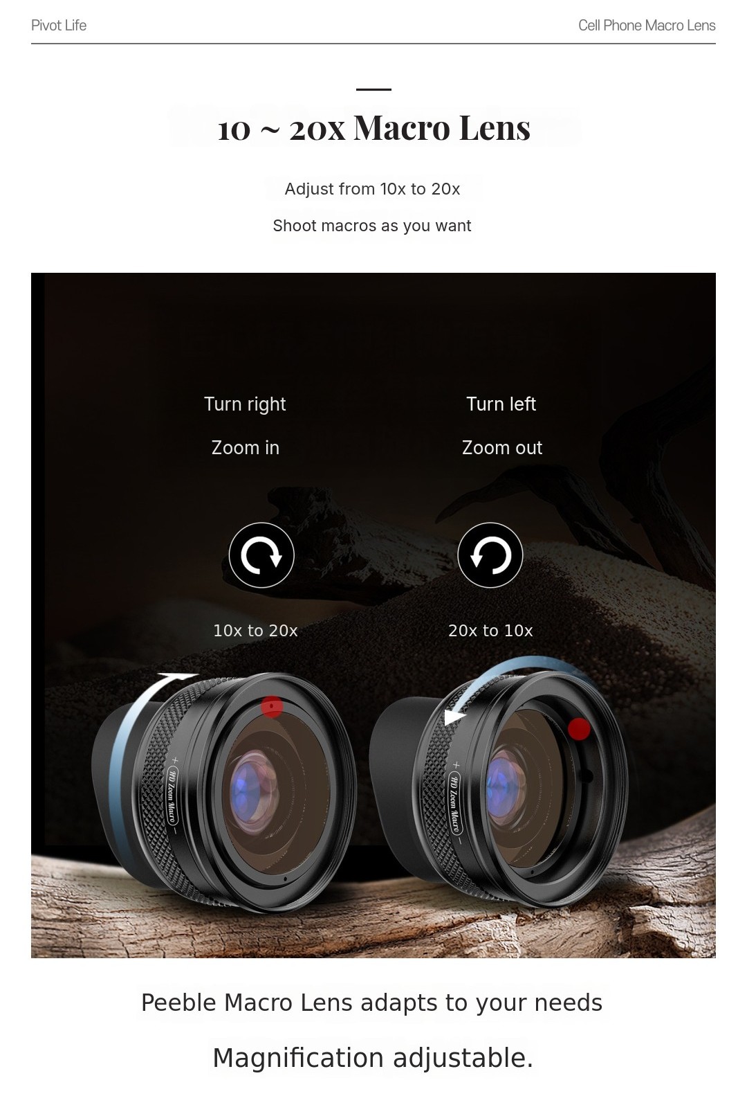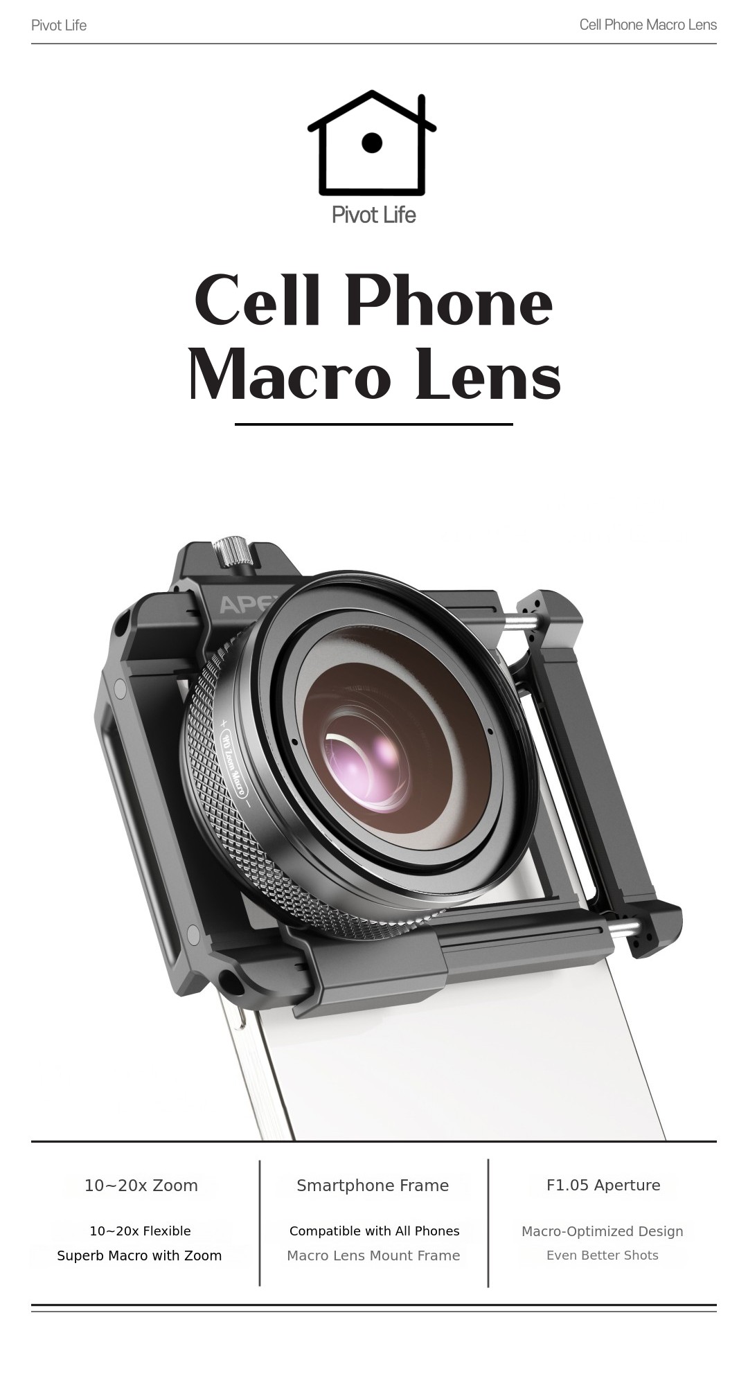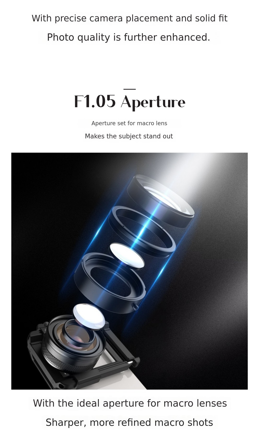 1. 📱 Smartphone Macro Lens - High-quality macro lens with 10-20x adjustable zoom 2. 🔍 Detailed Close-up Shooting - F1.05 aperture enables bright and sharp macro photos 3. 🎁 Exclusive Crowdfunding Offer - Special discounts on single and double set purchases