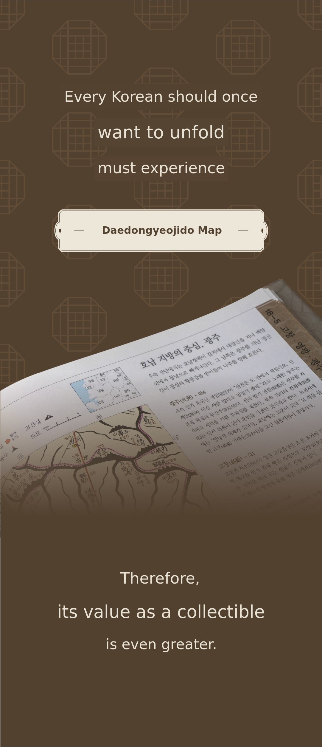 Daedongyeojido is a map that everyone knows but has never really seen.The more you learn about Daedongyeojido, the more you realize it is an extraordinary legacy. It divides the entire country into 120 uniform sections, was produced with woodblocks for mass distribution, and you can even feel the wisdom of Gosanja Kim Jeong-ho, who designed it in a folding accordion style so it could be spread out like a folding screen.