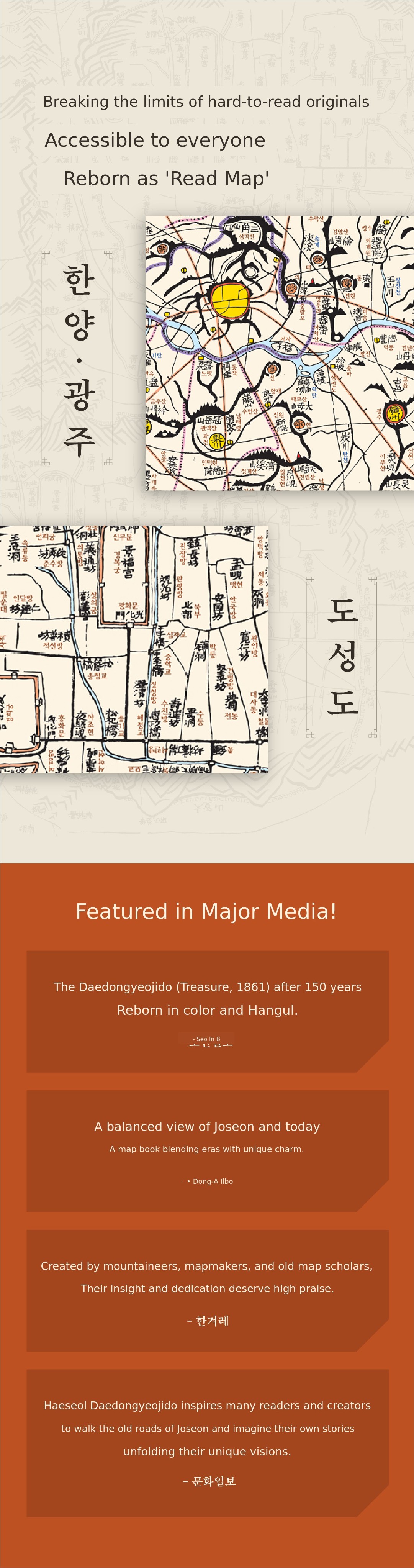 <Hangul Reduced Edition of Daedongyeojido> is for everyone.It is edited as a 'Hangul Notation Daedongyeojido' so that anyone can easily read Daedongyeojido, and all place names and notes are accompanied by Hangul..