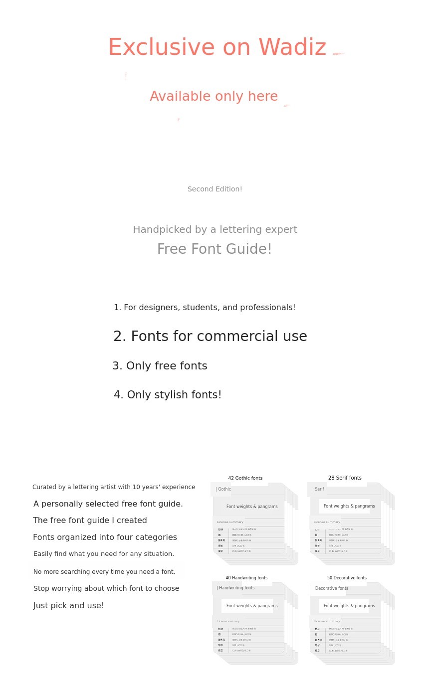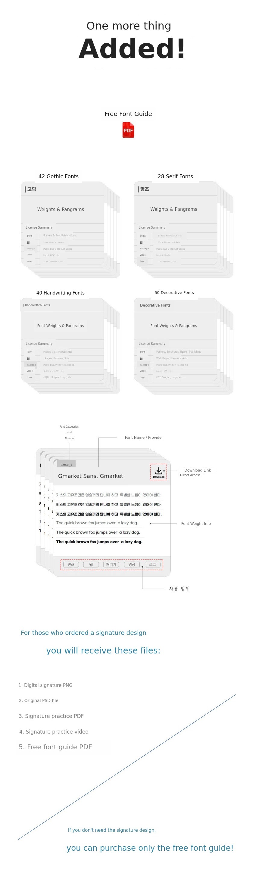 The table of contents is divided into main categories such as Gothic, Myeongjo, Handwriting, and Decorative, and you can easily identify each font at a glance with samples. In addition, hyperlinks are applied to the content, so clicking download will take you to the corresponding webpage.