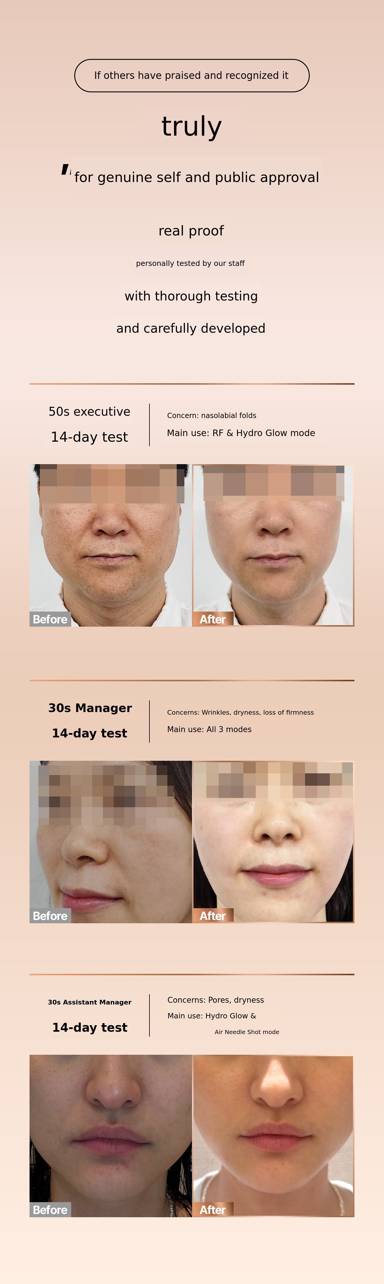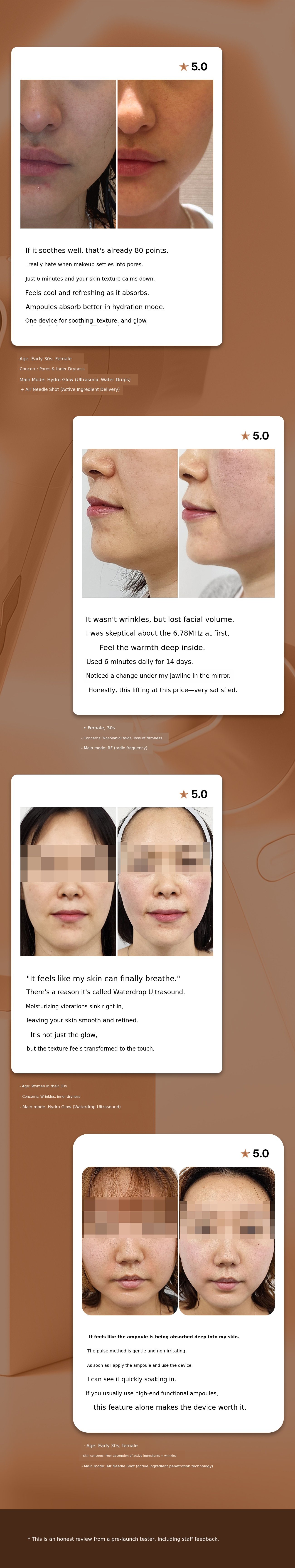 To solve these concerns, I set out to develop a home care beauty device. Although it would have been possible to release a product in a short period, I had to consider the correlation between the output limitations of home-use products and their clinical effectiveness, as these are not devices used by medical professionals. During this process, I conducted research and clinical trials with numerous medical professionals and engineers, but creating a device I could be truly satisfied with was never easy.