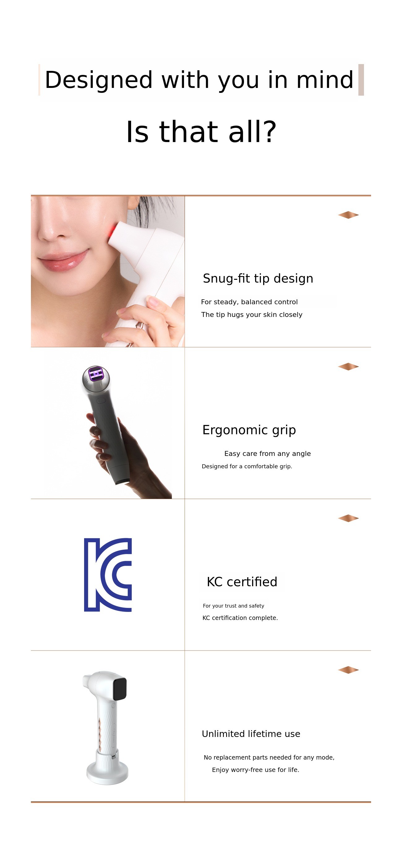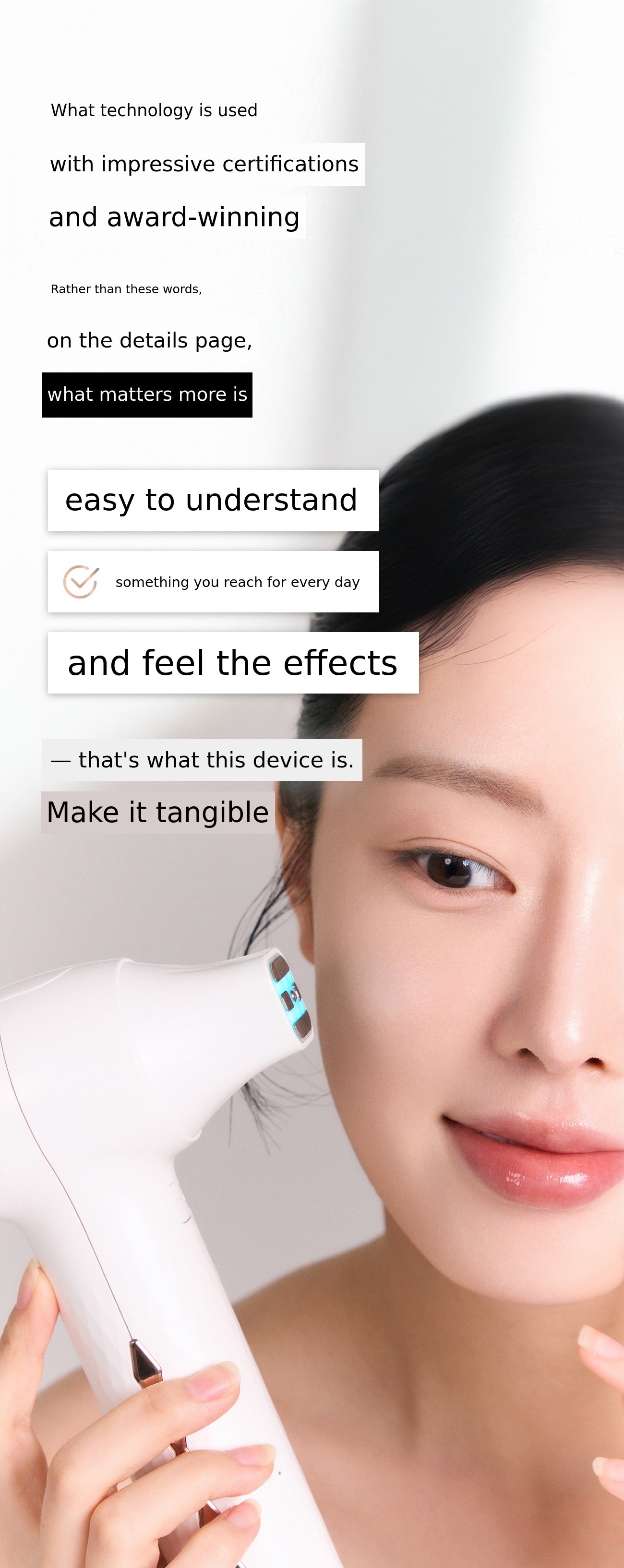 Of course, it is impossible to make personal home devices with the same output as medical devices. However, based on the clinical know-how and technological expertise of a medical device manufacturer, we are committed to ushering in a new era of 'home care devices' by creating beauty devices for home use that are as close as possible to the effects of medical beauty devices.