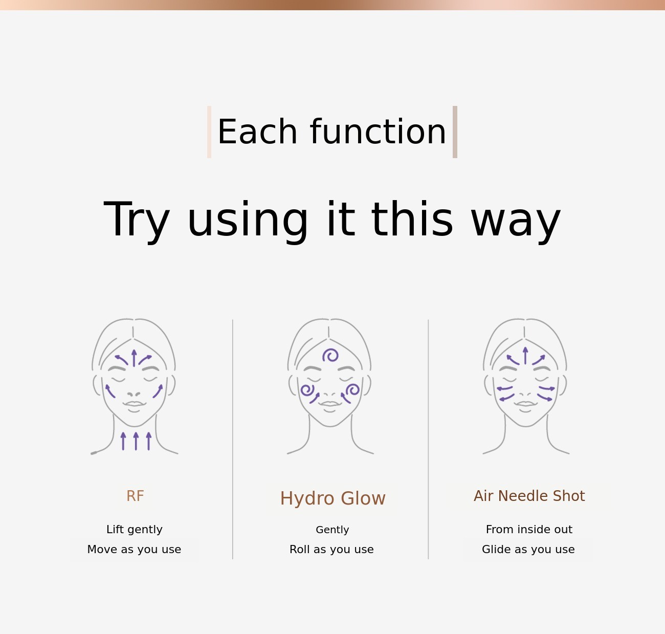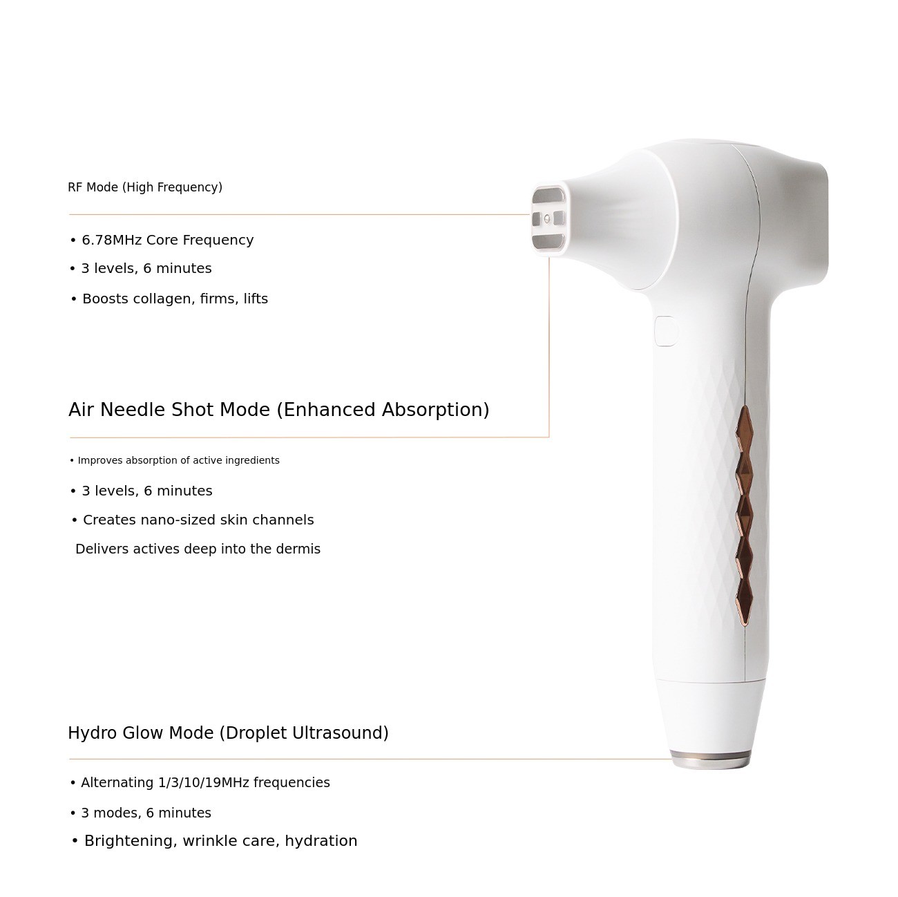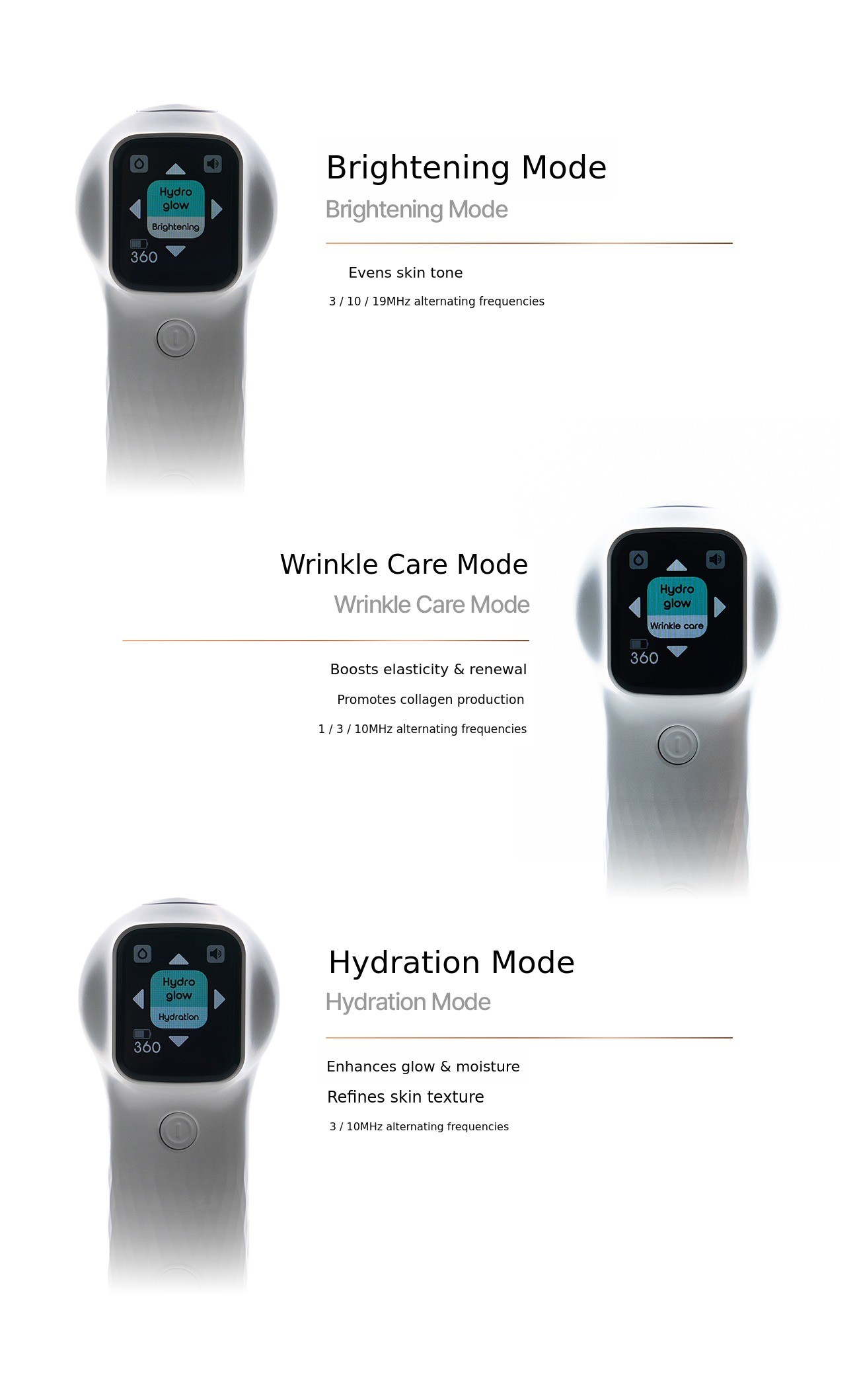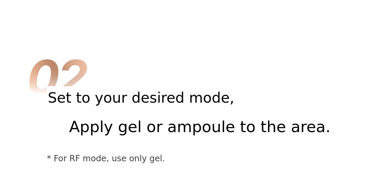 - When using the RF mode, be sure to apply gel. When using the Hydro Glow mode, be sure to apply gel or ampoule.