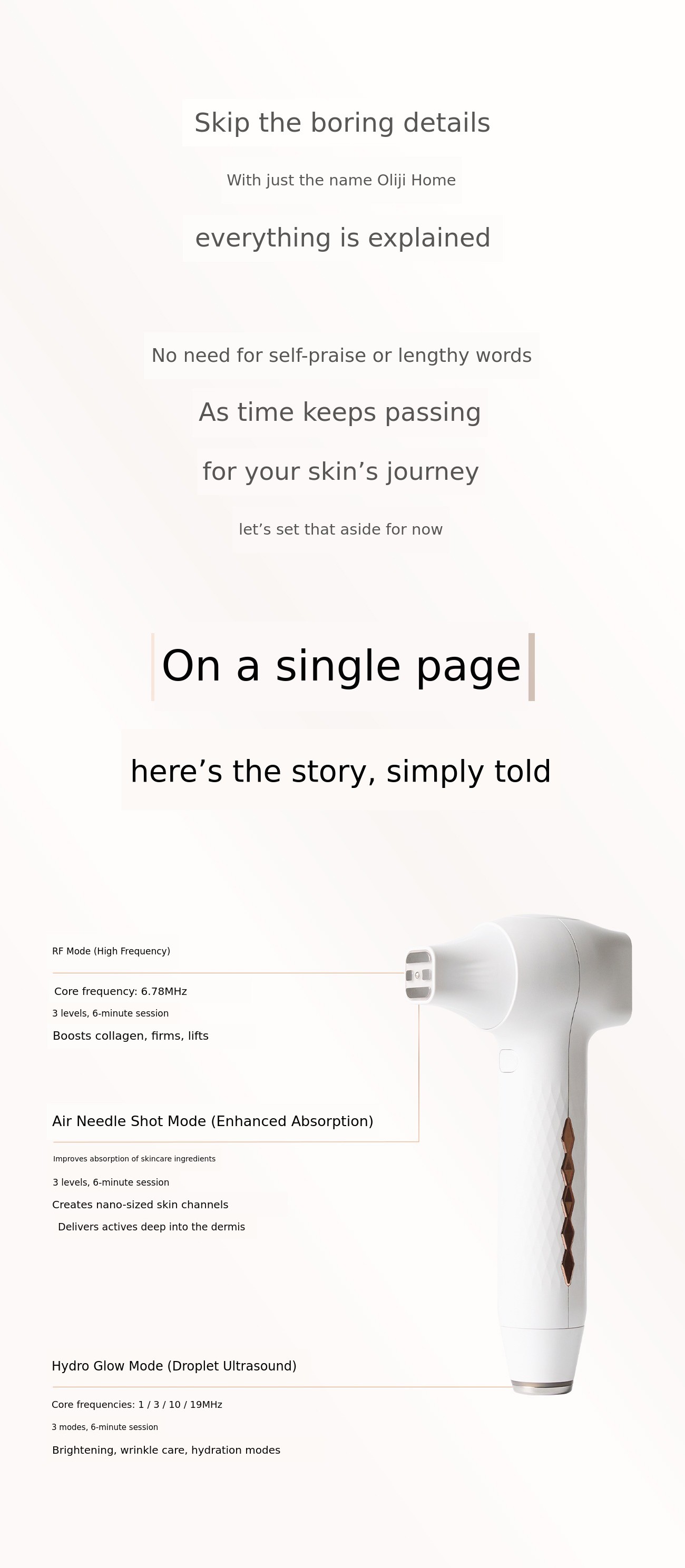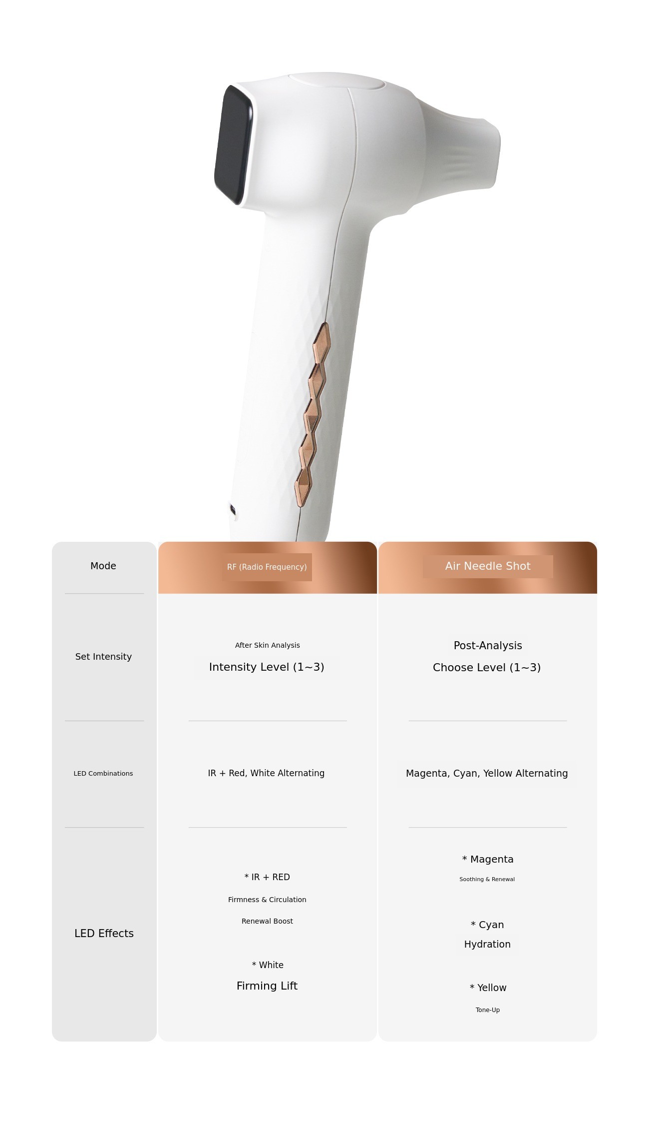 : RF and Hydro Glow modes effectively deliver heat and ultrasonic energy from the epidermis to the dermis. These energies promote collagen production, helping to improve skin elasticity, lifting, and skin tone. The Air Needle Shot mode allows active ingredients in cosmetics to be absorbed deep into the skin. The Magenta, Blue, Yellow, and Red LEDs used with RF and Air Needle Shot modes provide synergistic effects. In this way, the modes included in Olizy Home can cover all aspects of fundamental skin care.