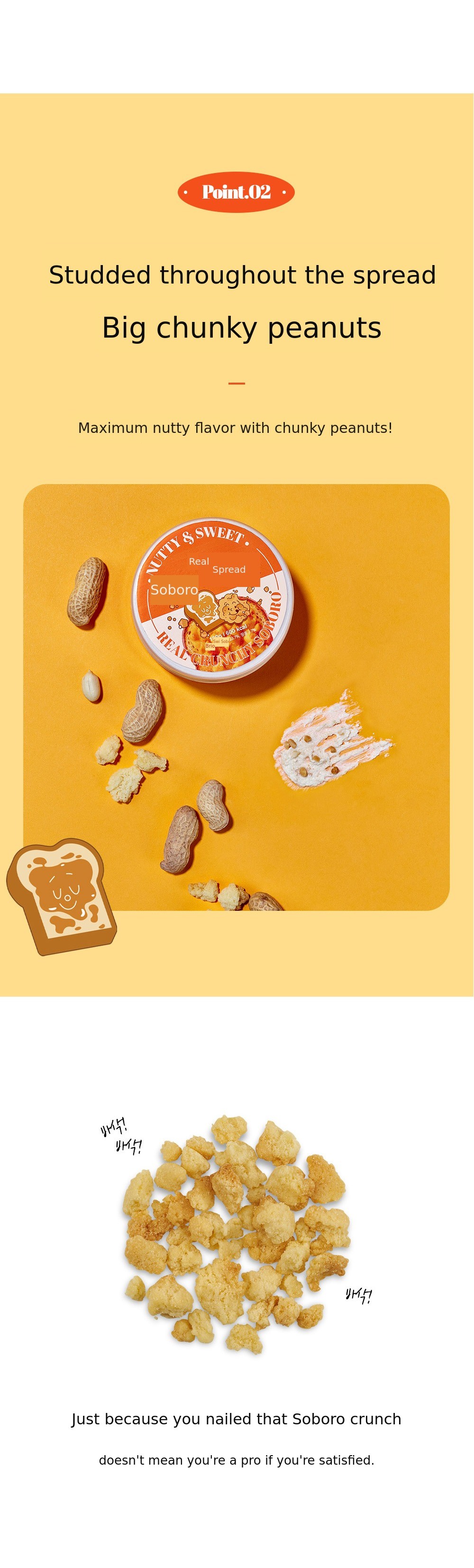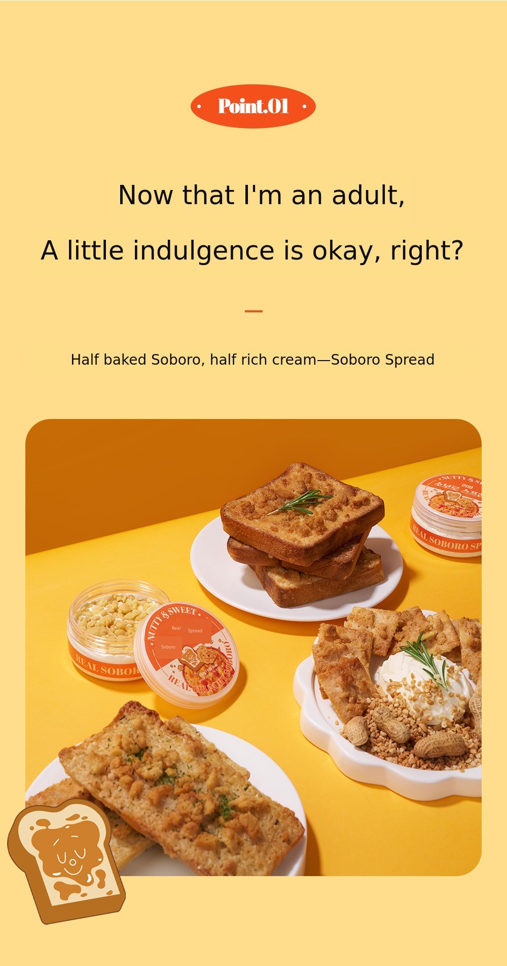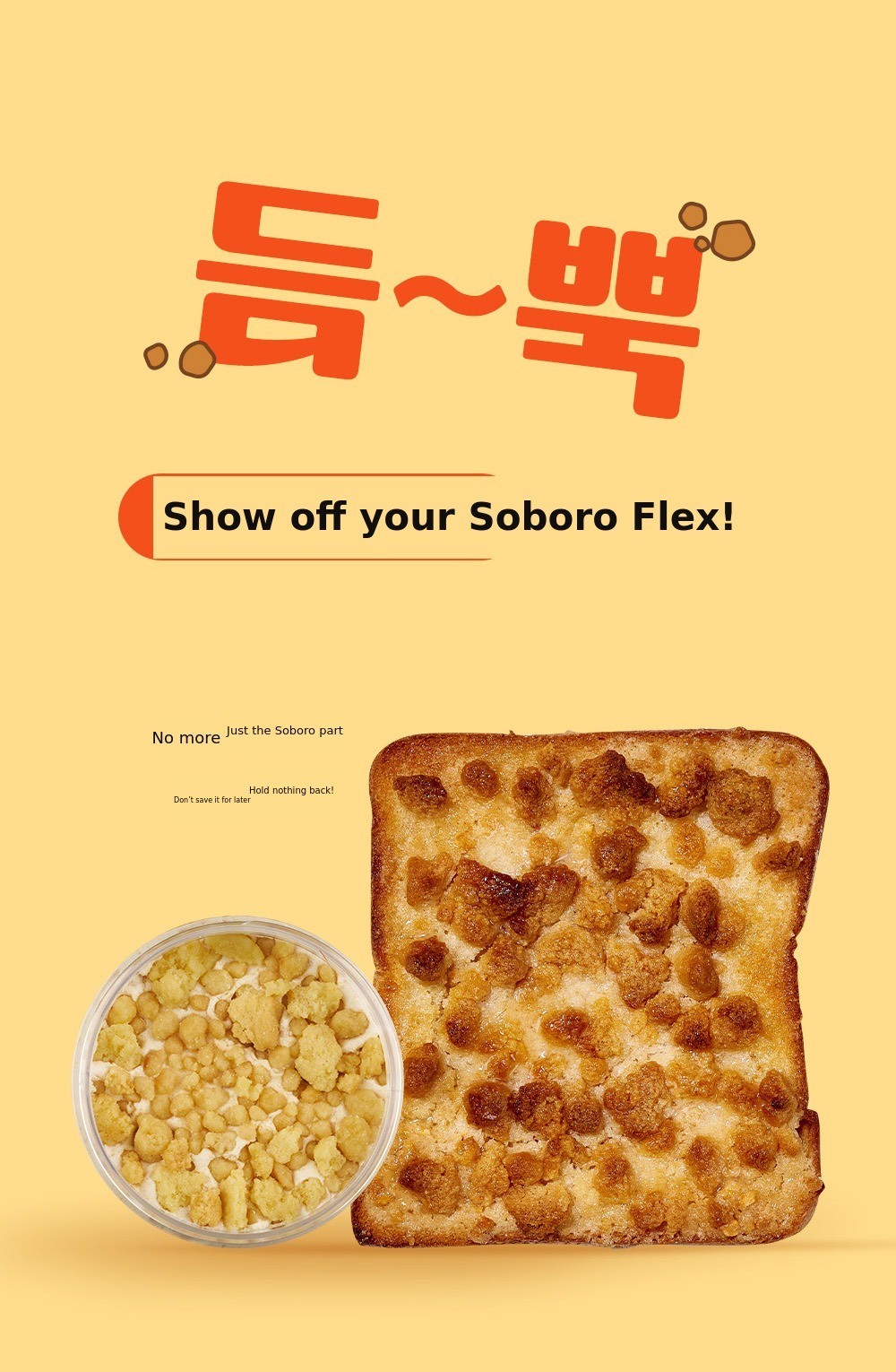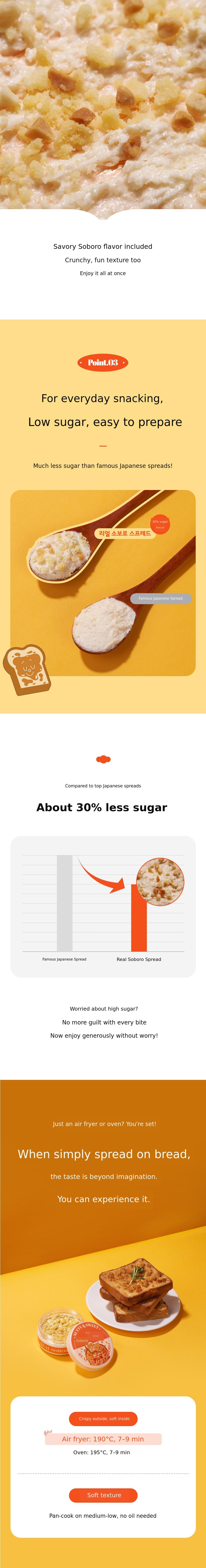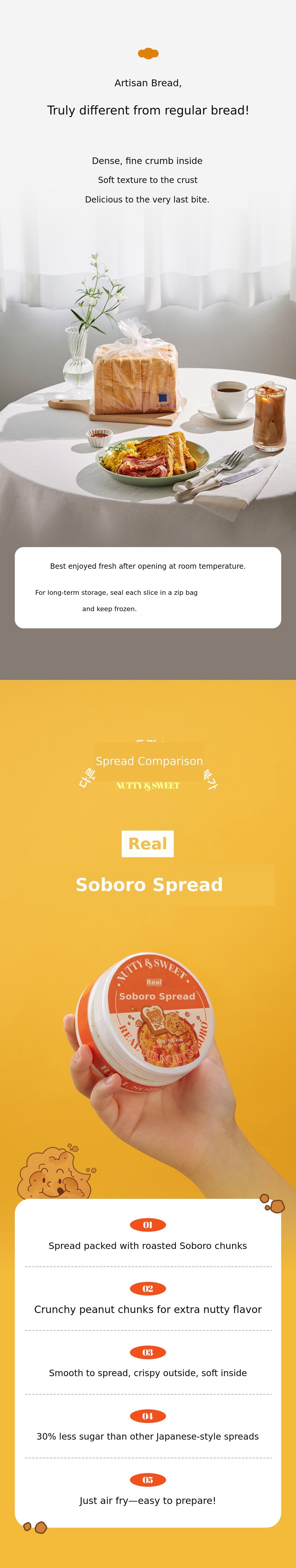 1. ๐ Real Soboro Cooking Spread - Cooking spread with baked soboro chunks and crunchy peanut pieces 2. โจ Crispy Texture and Nutty Flavor - Innovative product replicating bakery soboroโs crispiness and rich taste 3. ๐ Limited Set and Discount Benefits - Set including spread, fresh bread, and whole wheat bread with early bird discount