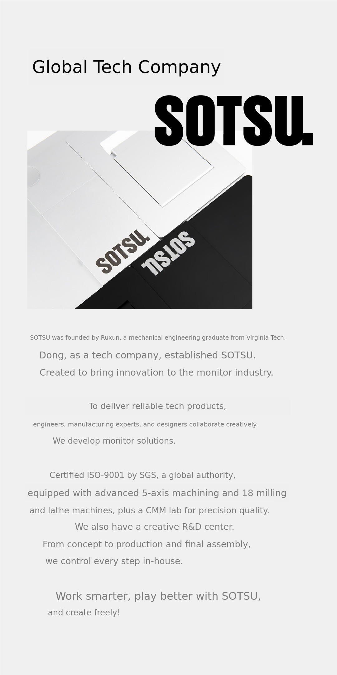 SOTSU is a sub-brand of Pinyu, a company founded in 2015 by Ruxun Dong, a graduate of the Department of Mechanical Engineering at Virginia Tech. Based on innovative technology, it introduces smart and creative products such as portable monitors.