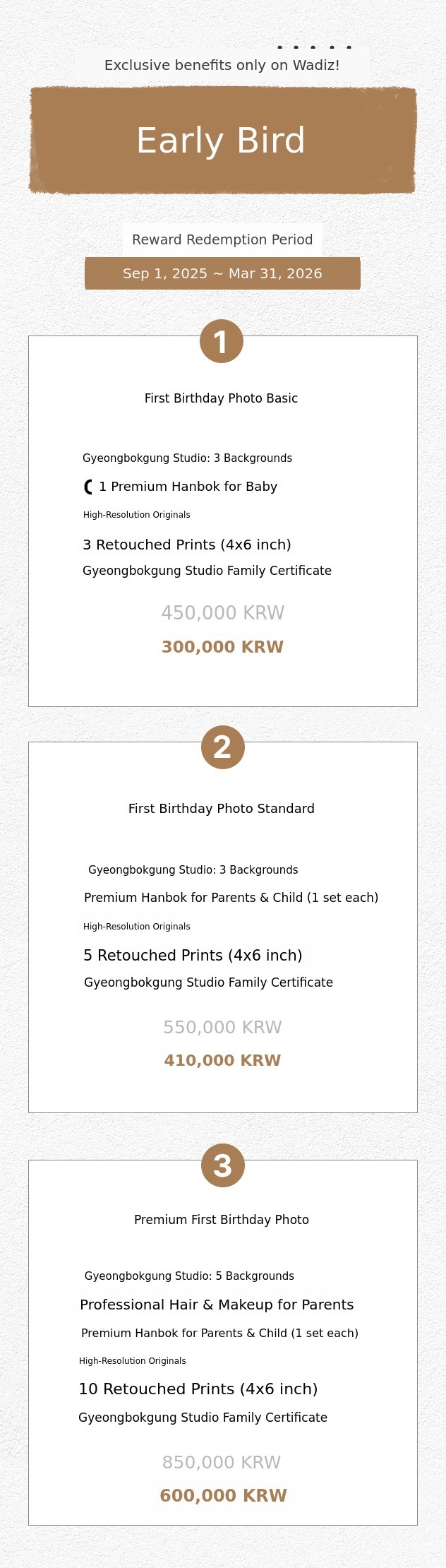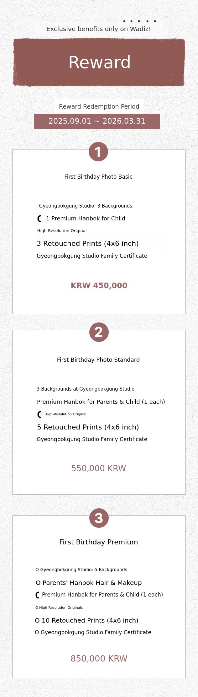 Outfits are included for both wedding and first birthday photos, but not for family photos. Props needed for the shoot are provided. Hair and makeup are only included in the premium package. The hair and makeup shop is 'Ellen Muse,' located a 5-minute walk away.