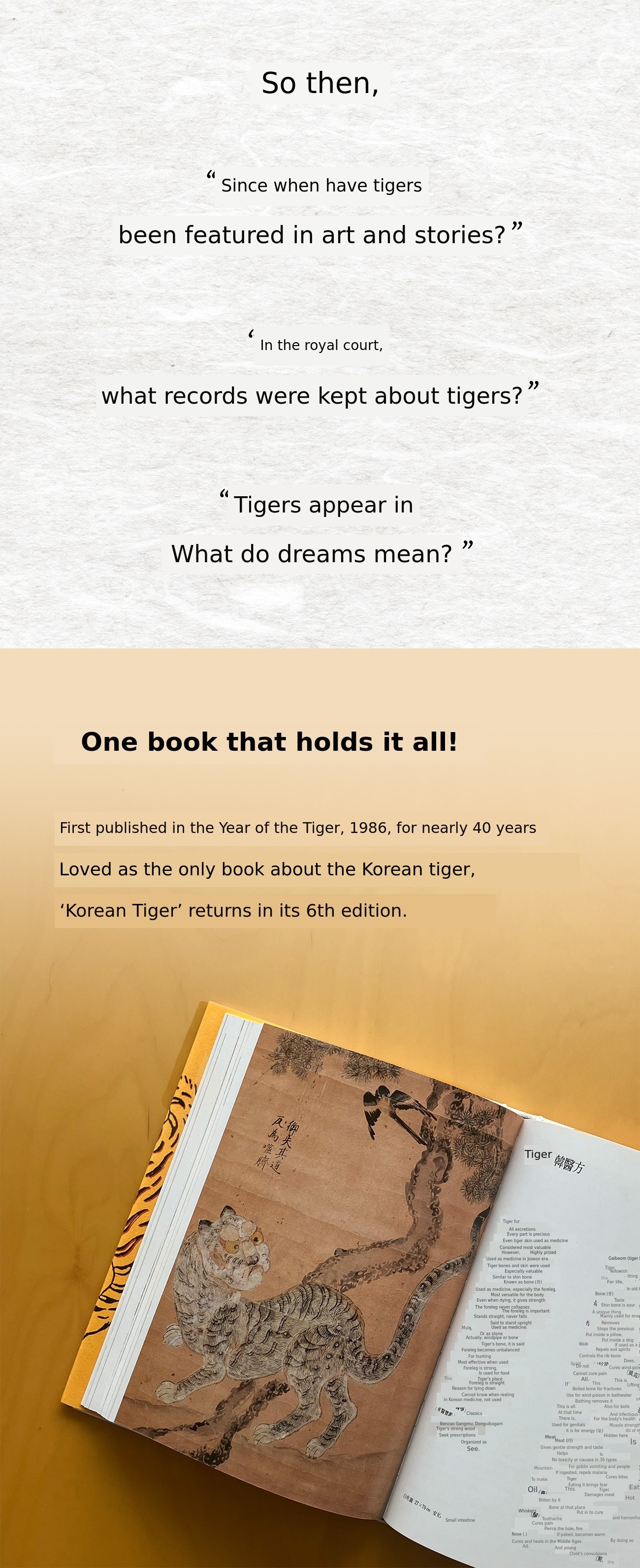 Korea is undoubtedly a country with outstanding tiger paintings and stories in the world. Among all things, the most abundant folk theme is surely the 'tiger.' It has been over forty years since 'Korean Tiger' was first published. The reason this book has been loved by so many readers for such a long time is that it contains every image of the tiger that has existed in our history and in the imagination of our people.