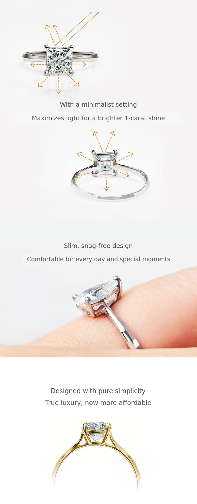 Sits low So it doesn't get in the way,Simple setting With a wider diamond light reflection areaEven more sparkle It is