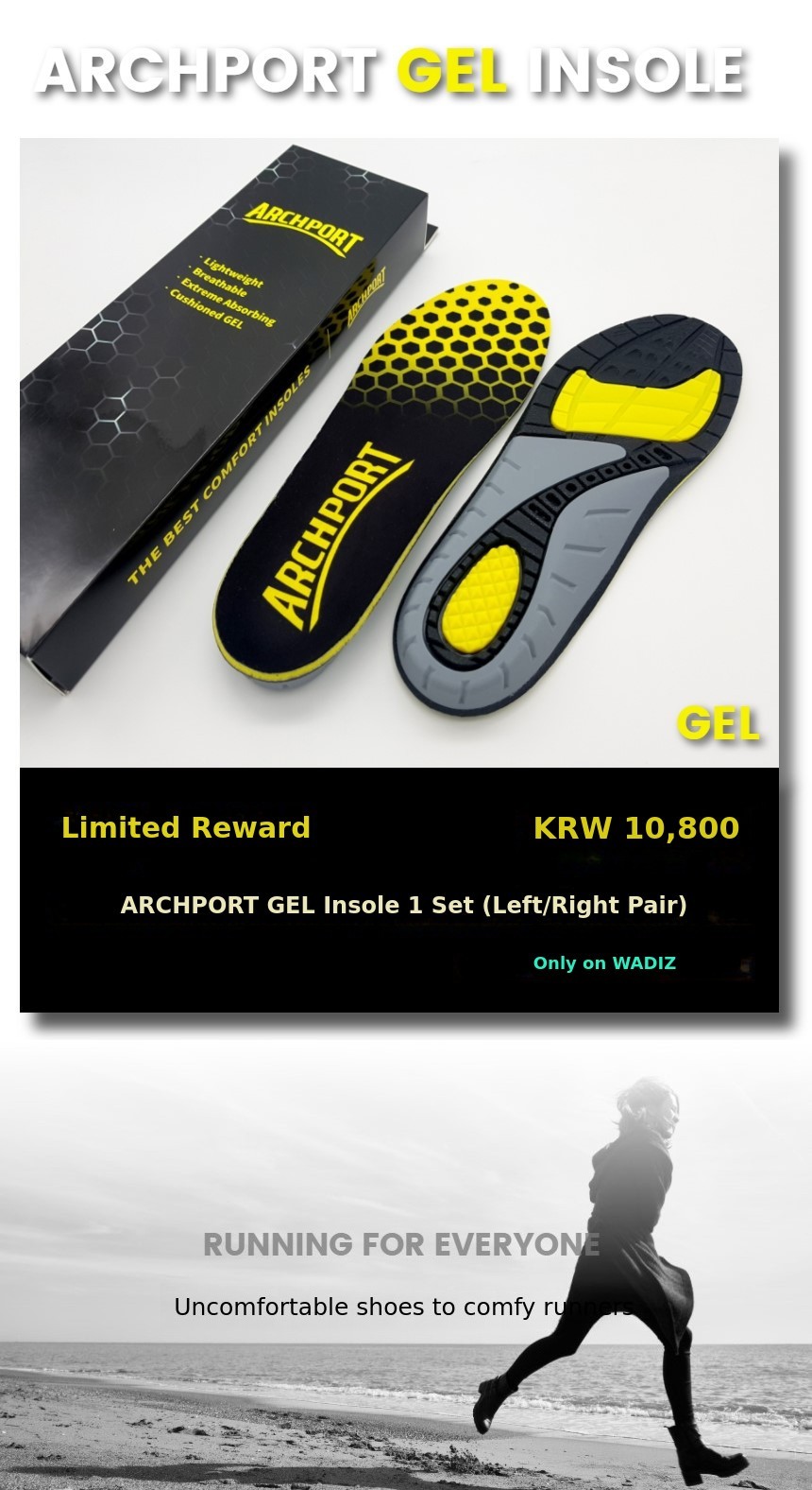 In this funding, inside the insole,Logo printing,Non-slim hole length slightly modified, has been done.. (ARCHPORT GEL insoles are exclusively distributed on Wadiz.)