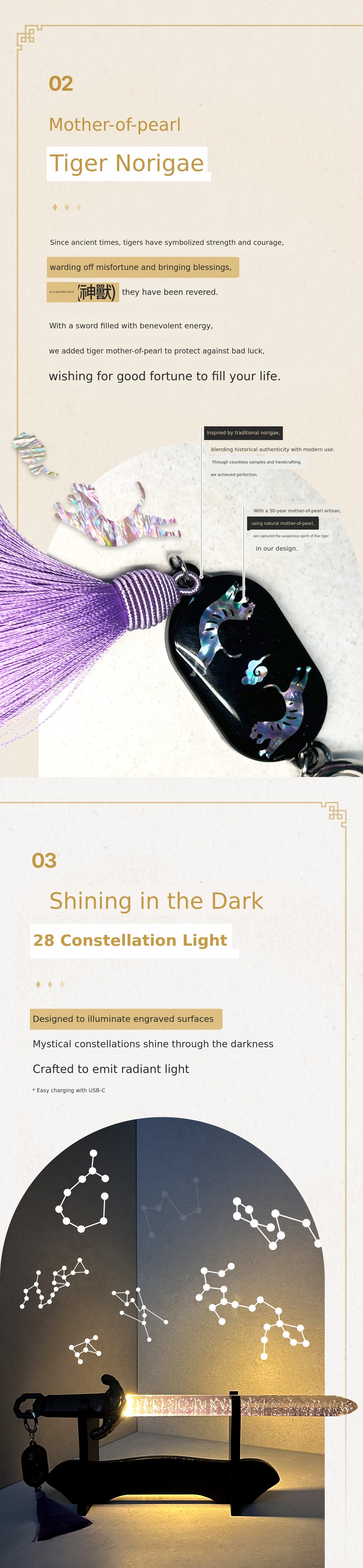 - Costs for 3D design, mold production, and first and second prototype production to realize the Saingeom's unique tiger-shaped hilt and transparent blade with constellations.