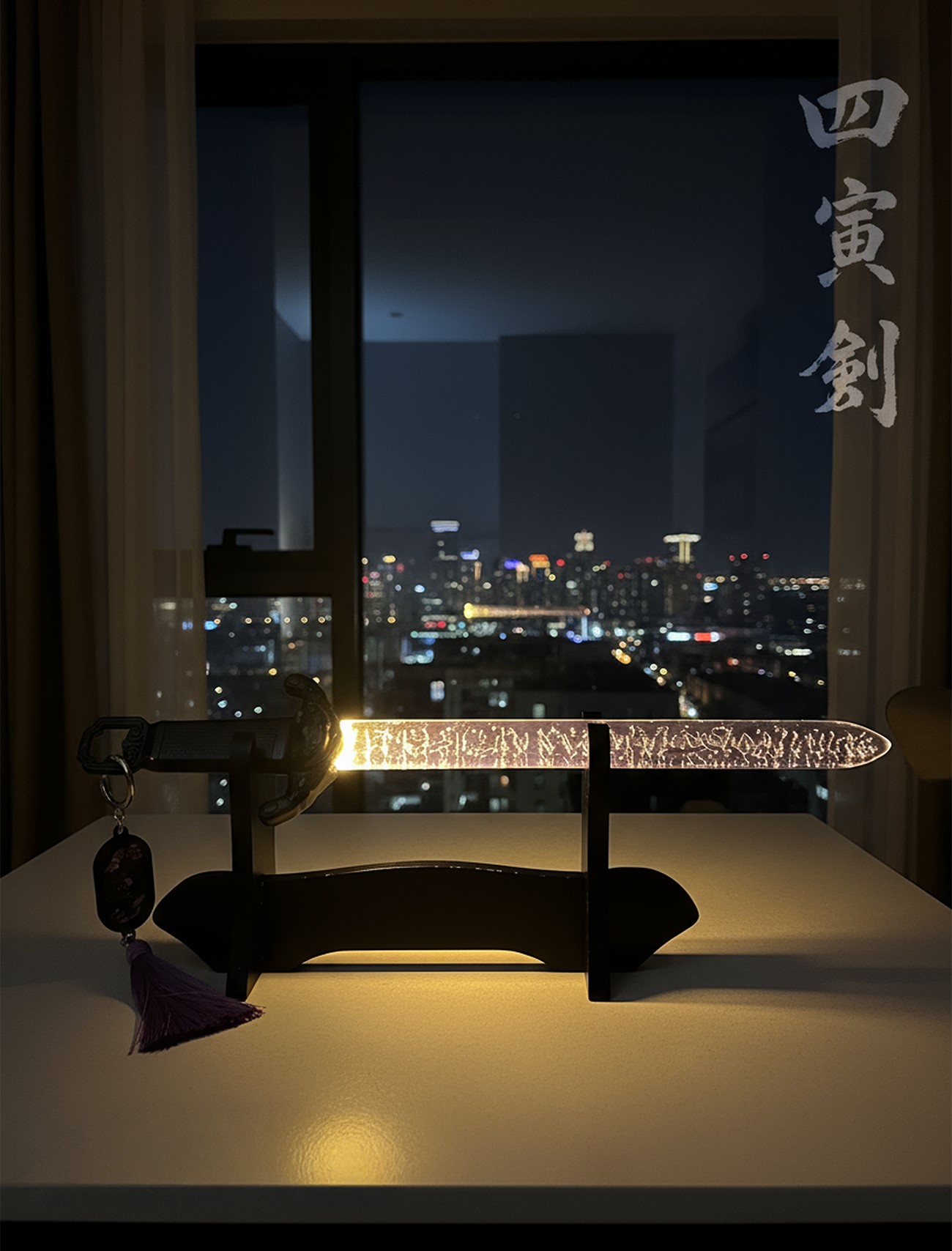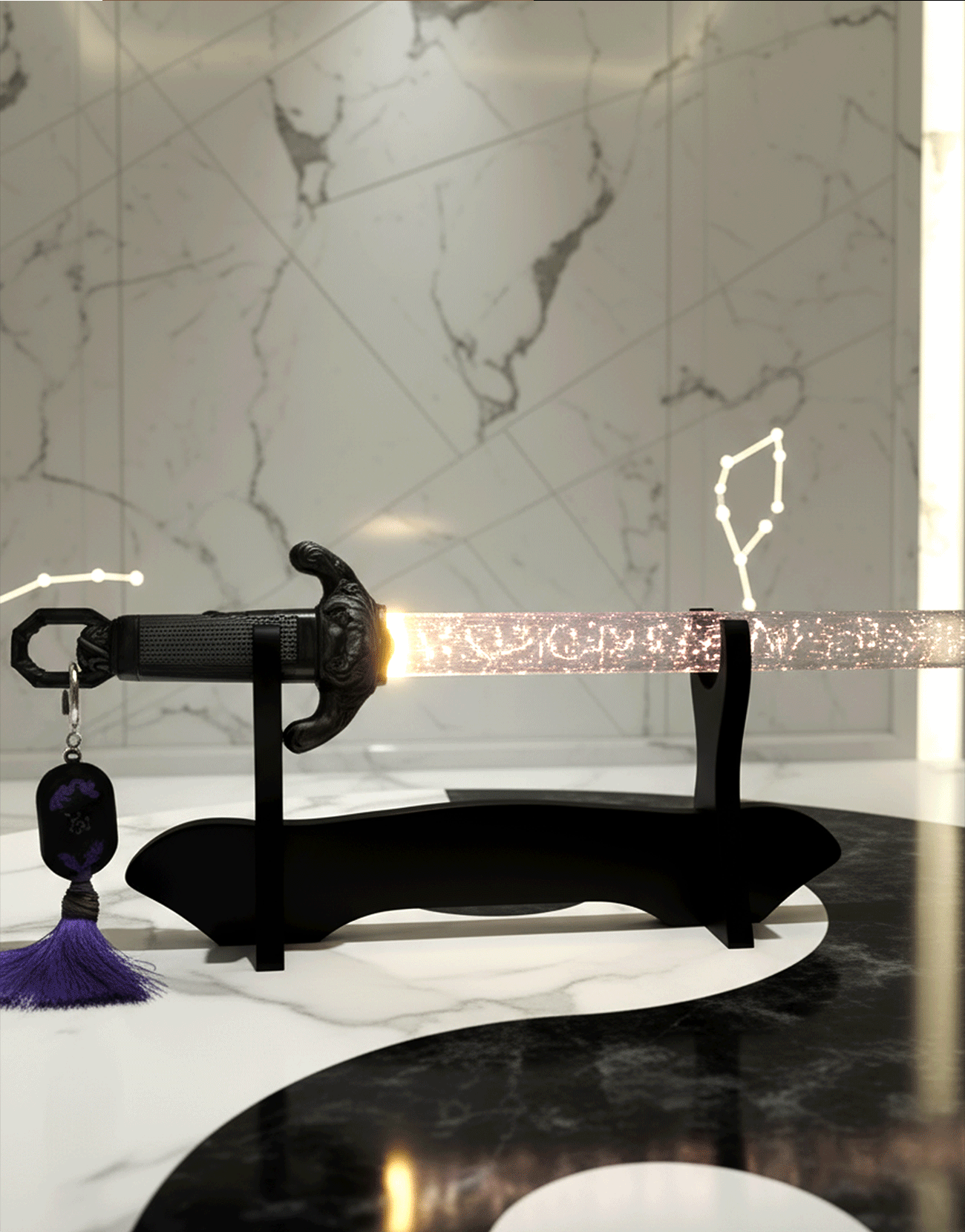 The transparent blade with constellations emits a gentle light when illuminated,