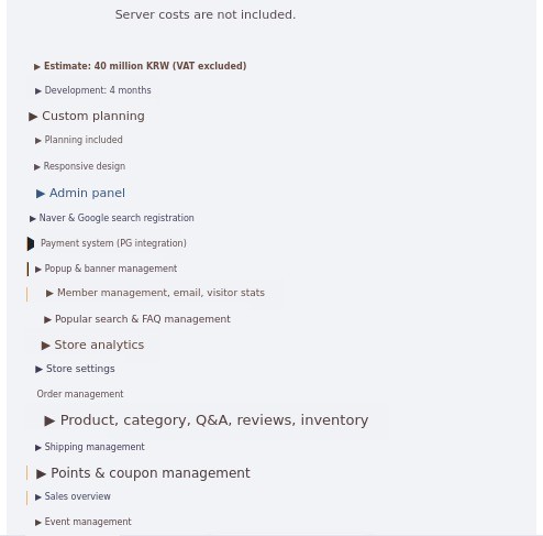 โ ย Cost of outsourcing development -ย Even creating a simple website starts at a minimum of 5 million KRW. If the features are even slightly more complex, it easily exceeds 10 million KRW. For a mobile app, 30 million KRW or more is standard, and including an automation system can cost tens of millions of KRW.