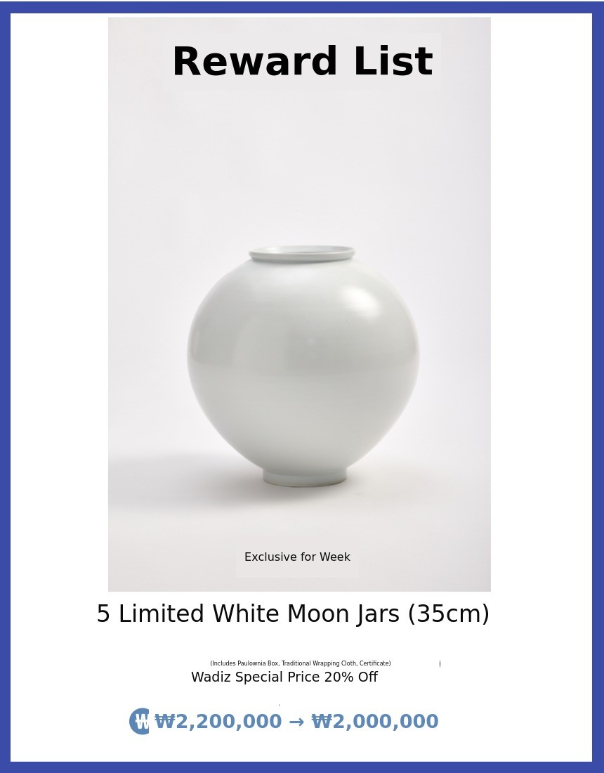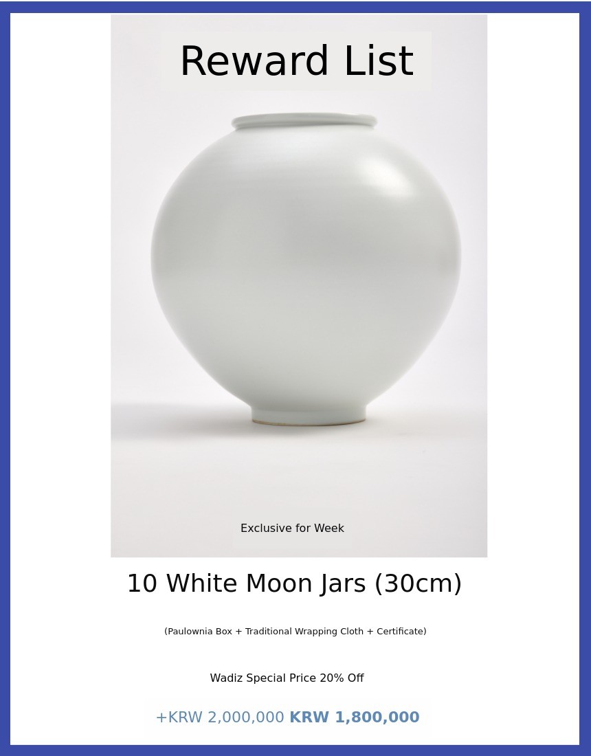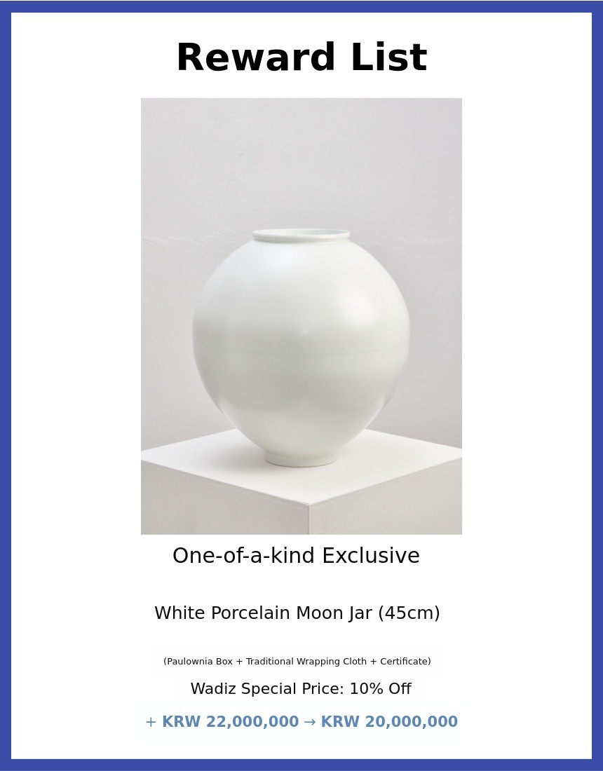 In this funding, we are presenting the Baekja Moon Jar, which was loved by many supporters last year, in a pre-order format. As it is a limited quantity, we chose the Wadiz platform to create the best synergy, and we have worked hard to provide the greatest benefits to our supporters.