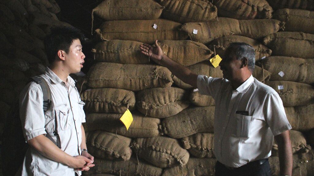 인도에서 커피를 수입하기 전 품질상태를 확인하기 위해 공장 관련 설명을 듣고 있는 박정우 대표
