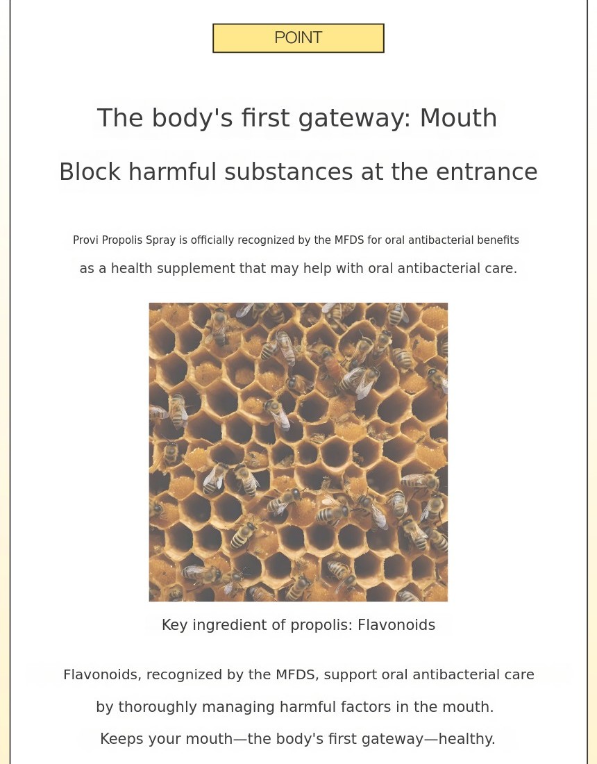 [Mission] Delivering 30 Years of Technology in Full Although we have supplied raw materials to countless products, we decided to make it ourselves to fully convey the hidden benefits of propolis. The patented technology and scientific data from 30 years of research prove its complete efficacy. With uncompromising quality, we will set a new standard for everyday propolis with PROBEE.