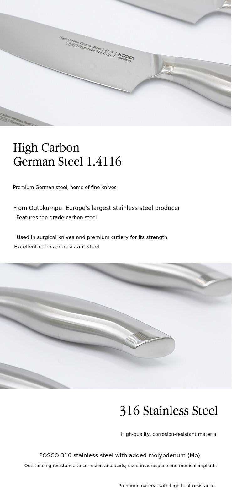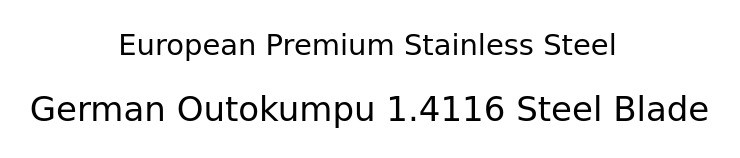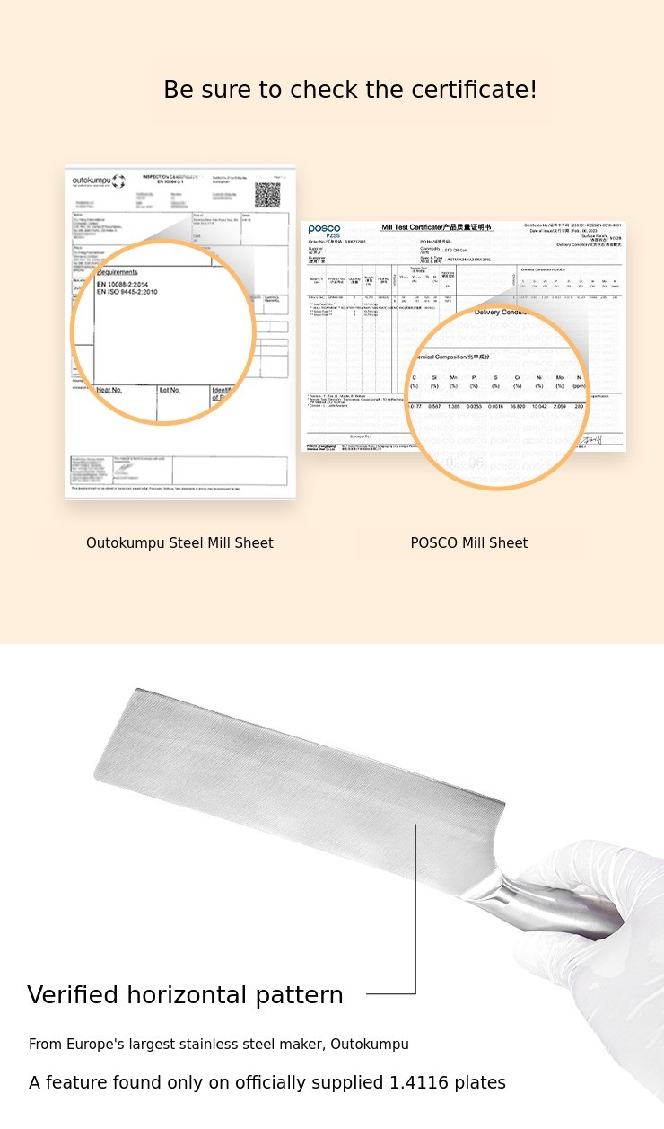 Europe's largest stainless steel manufacturer, Outokumpu, boasts the finest carbon steel,material 1.4116, which is used to make the blade, and with the addition of molybdenum, POSCO's 316 stainless steel, which has excellent corrosion and acid resistance,is used to make the grip,.