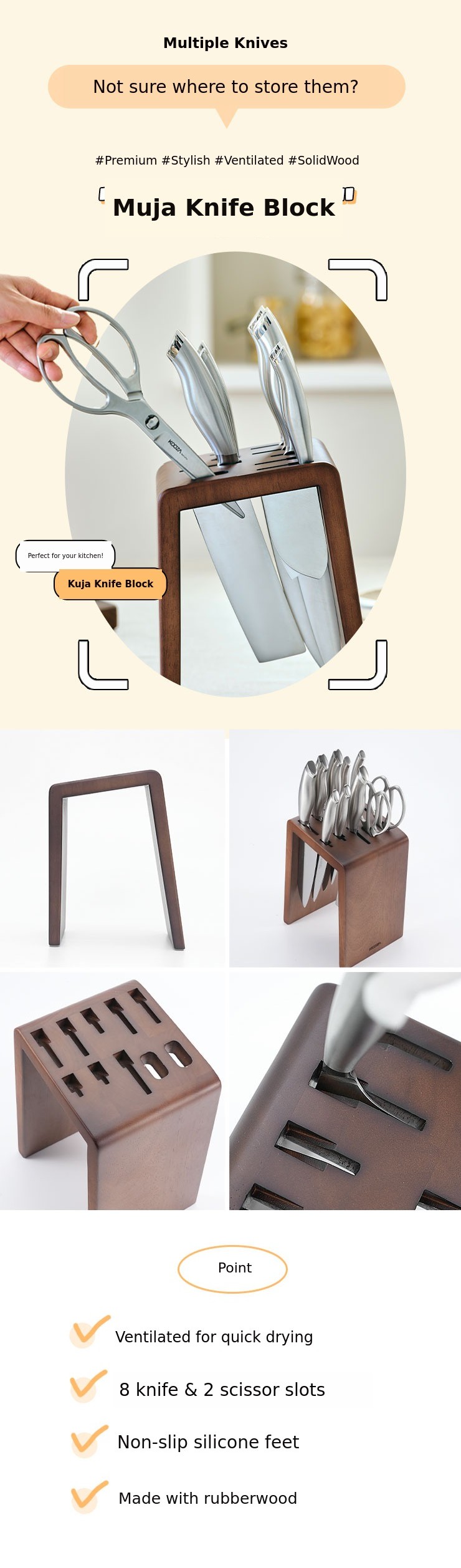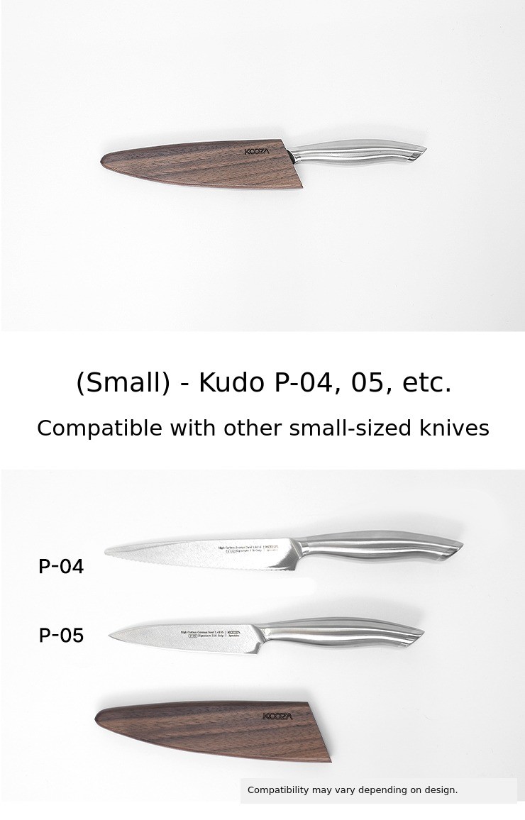 The Kuja wooden knife block can hold a total of 8 types of knives from Kudo P-01 (Santoku) to P-08 (Mini Chef Knife), as well as the Kuja scissors. You can also store your own knives and scissors!