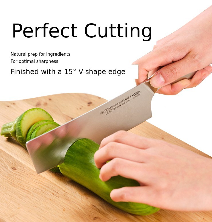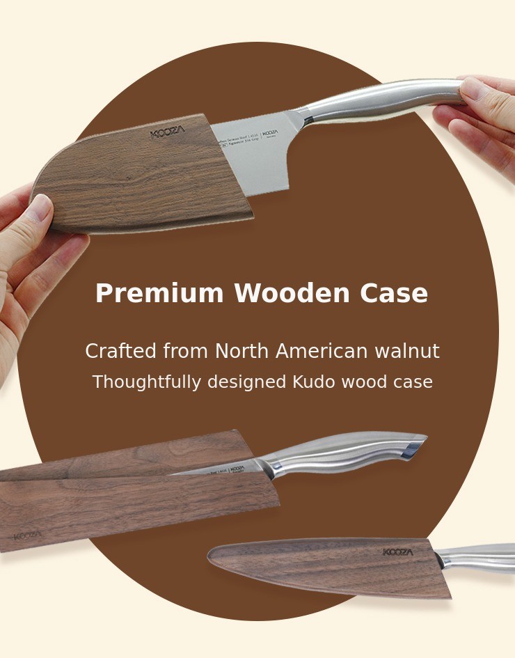 Kudo is confident even when compared to knives from famous brands,crafted with the optimal hardness of 58, and,finished with a 15-degree V-shape sharpening process, allowing you to handle ingredients naturally and easily. In addition, Kudois made with consideration for retention, toughness, and ease of sharpening.You can easily and conveniently manage and use it at home.