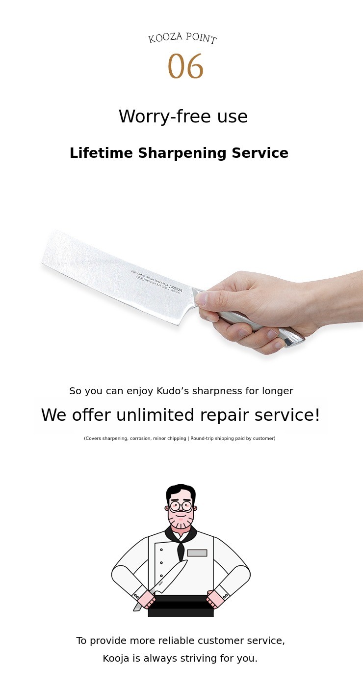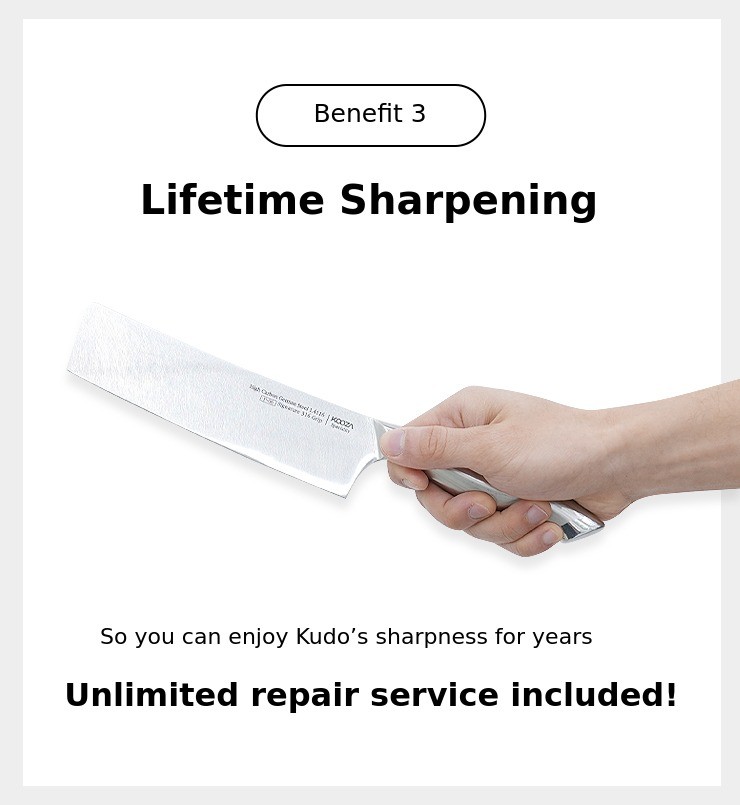 All Kudo supportersLifetime unlimited repair service is available for you.No more worries about dull blades! Experience endlessly pleasant cutting with Kudo.
