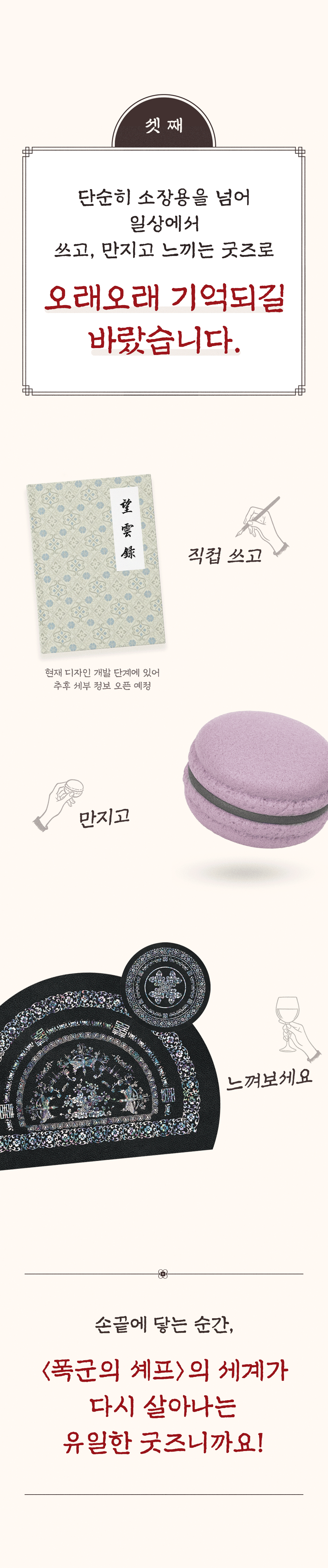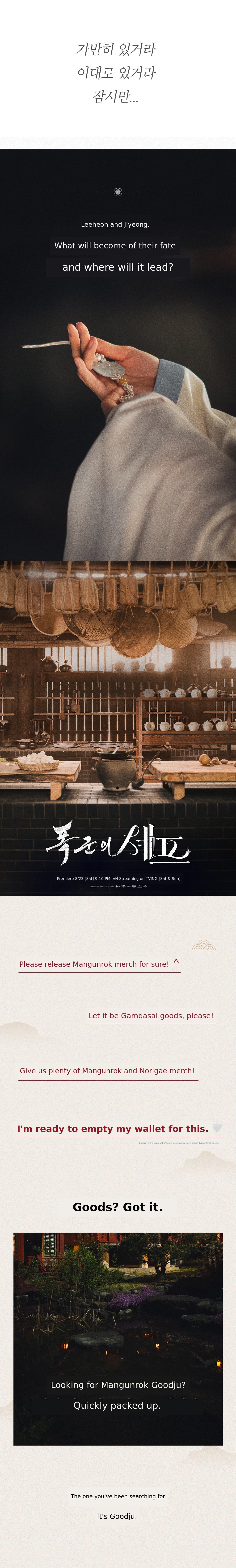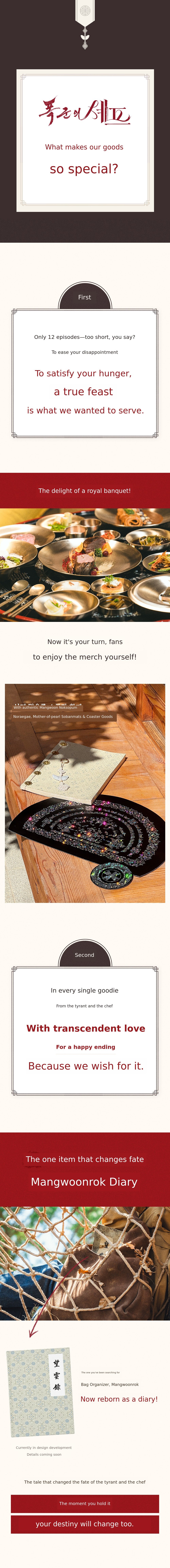 We do not simply want to present merchandise, but to write another story together with those who loved 'The Tyrant's Chef.' The second story of Mangwoonlog will be found in the records of our fans.