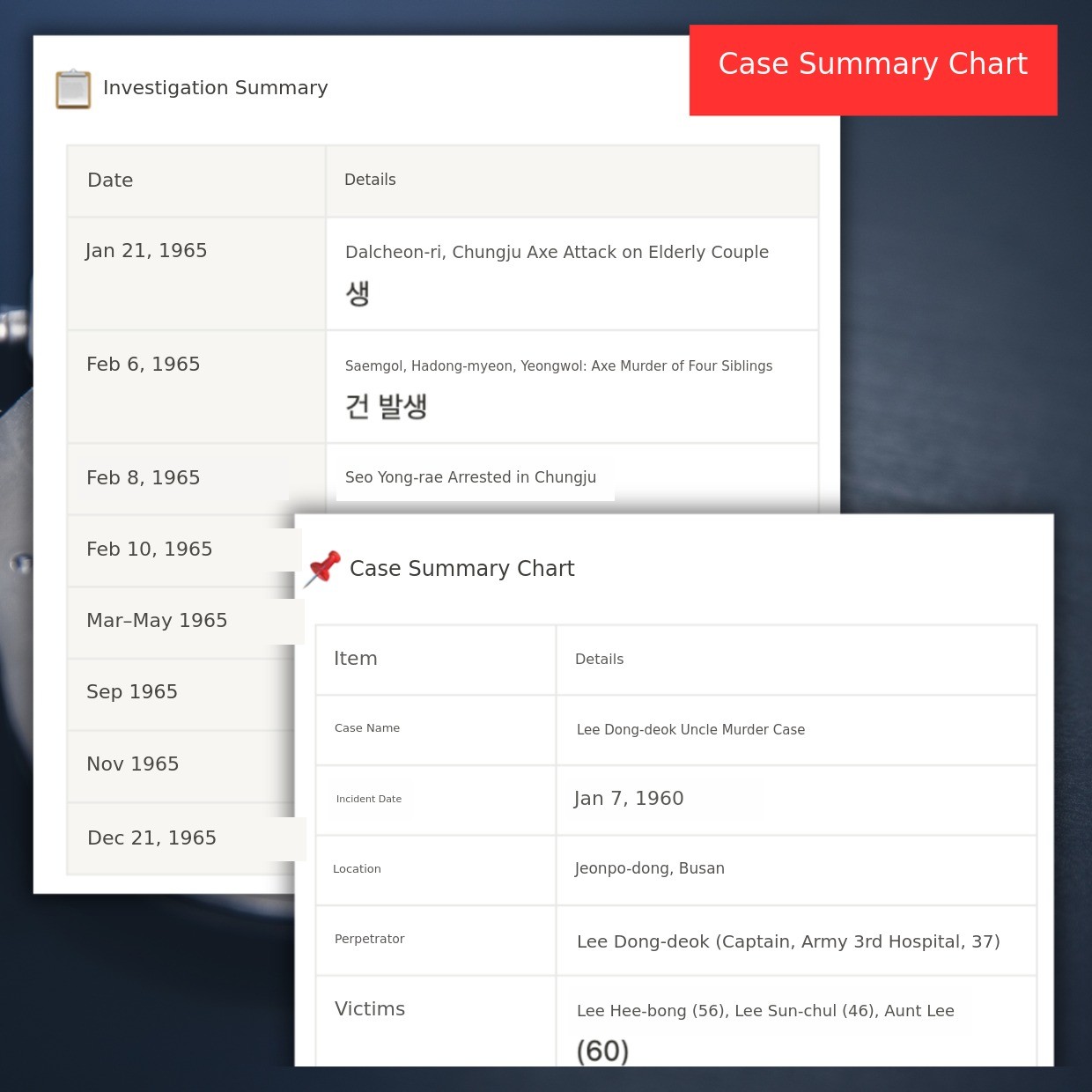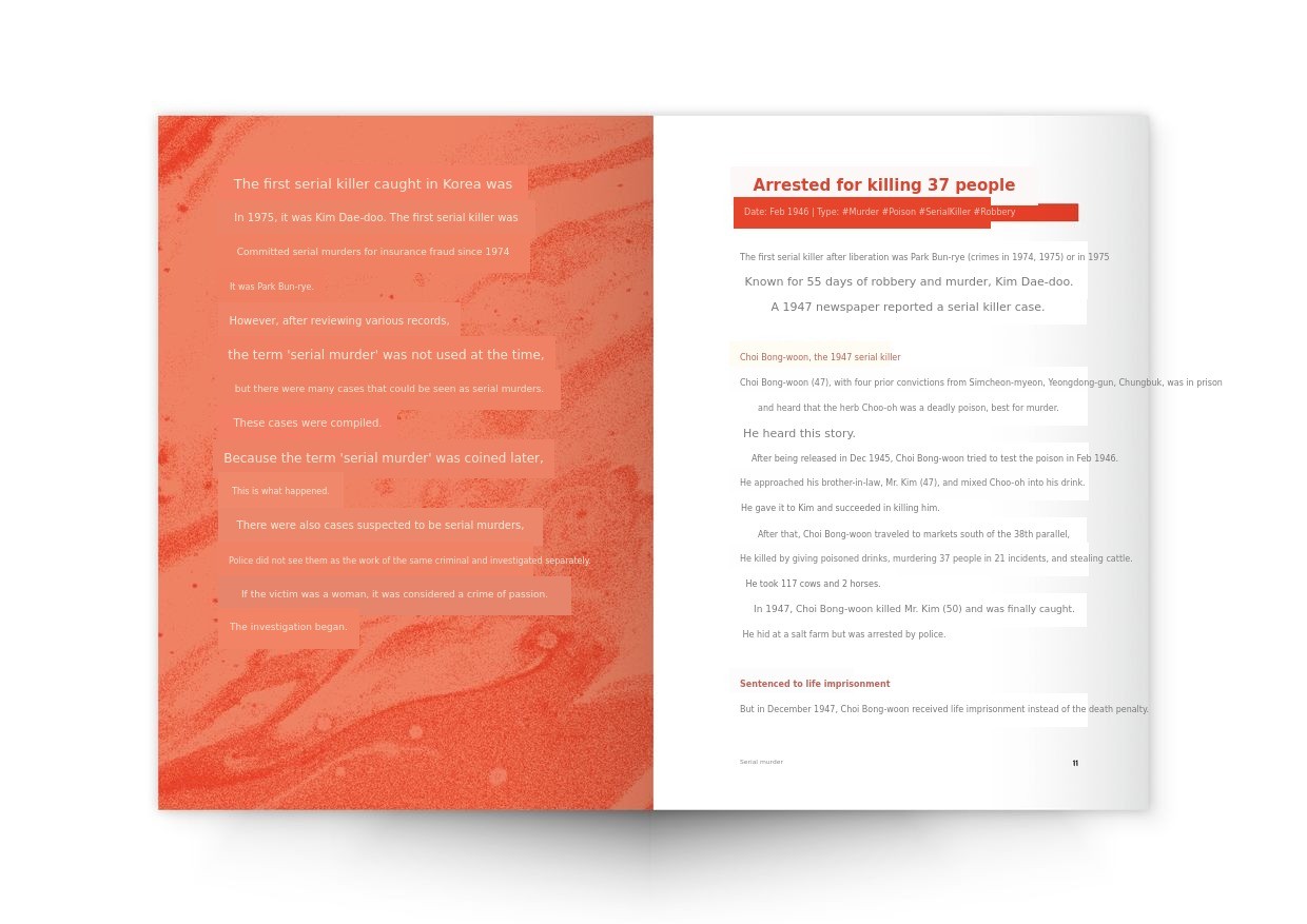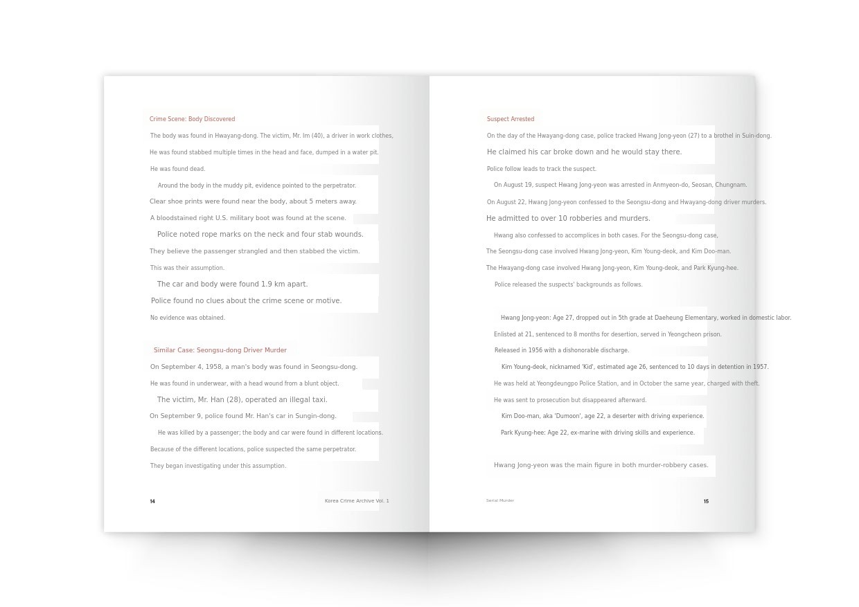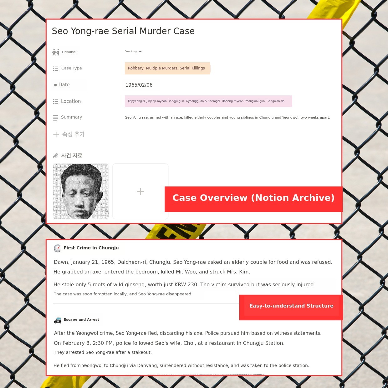 The <Korean Crime Archive> contains records not only of well-known serial killers such as Kim Dae-du, Park Bun-rye, Kang Chang-gu, and Lee Choon-jae, but also lesser-known serial killers, including Choi Bong-woon, the aconite serial killer first recorded in a Korean newspaper in 1947, Im Seok-bong, a gun-wielding serial killer and robber, and Yoo Hong-sik, who killed people in succession under the pretense of marriage.