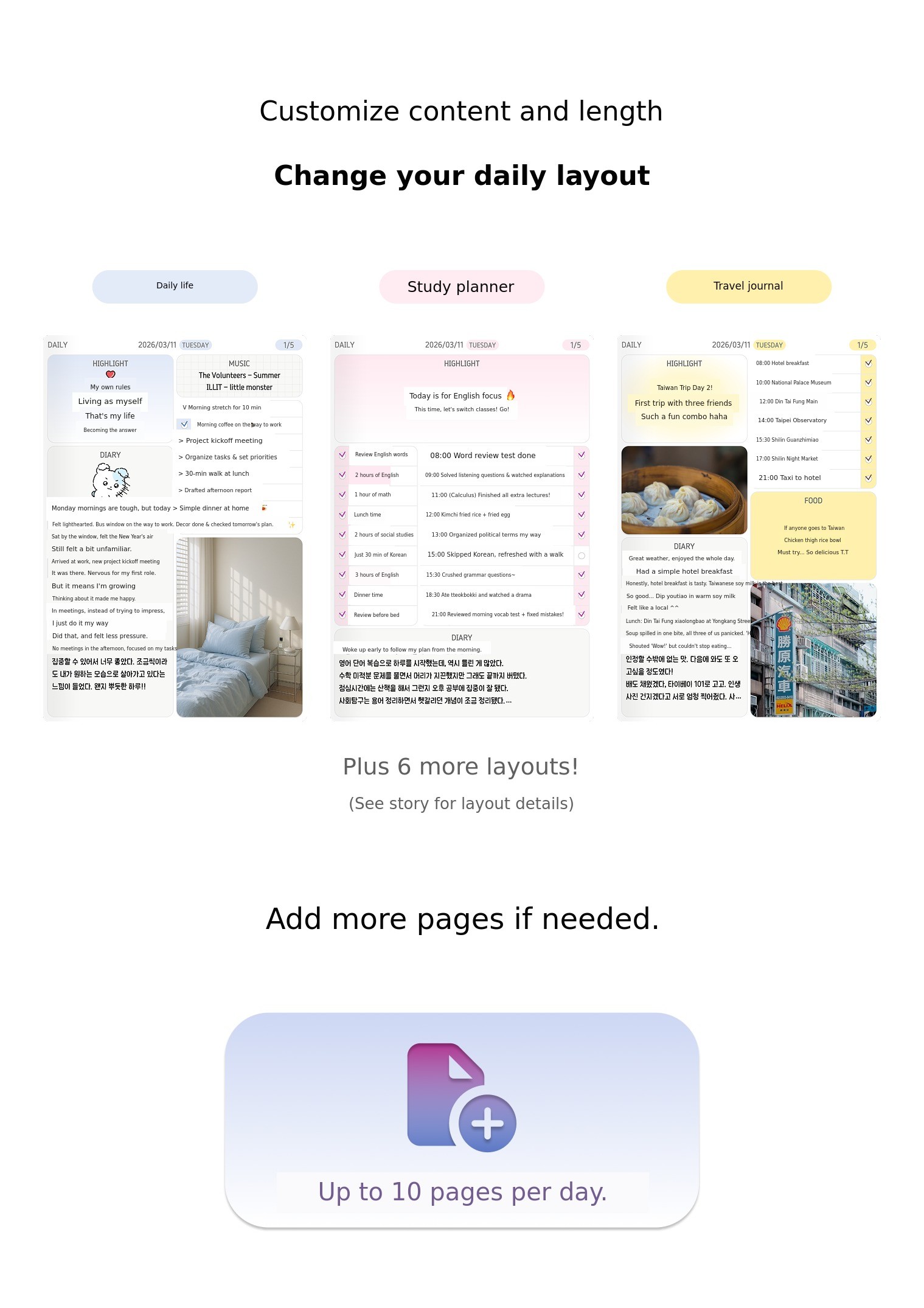 โ ย On days when you have a lot to write,Add a page and write as much as you want.* You can add up to 10 pages per day.