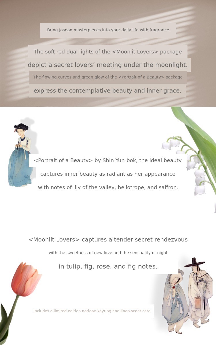 The beauty of hanbok comes not from extravagant decorations, but from the graceful lines of the garment and the aesthetics of empty space. Our fragrance, likewise, is not stimulating or attention-grabbing,but focuses on subtlety that enhances the user's inherent elegance.
