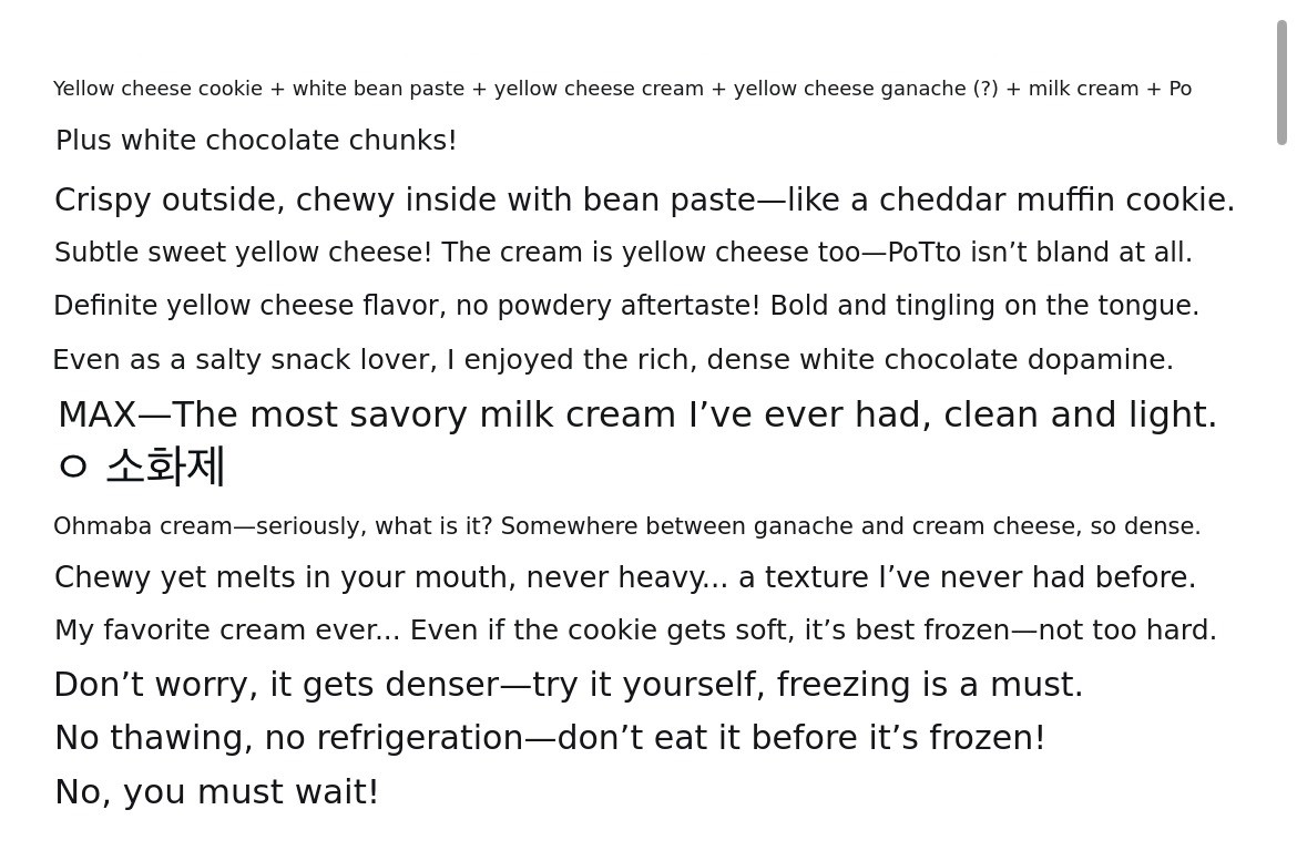Butter (New Zealand), sugar, salt, eggs, whipping cream, flour, yellow cheese powder, sweet bean paste, snack crackers, injeolmi powder, baking powder (Korea), cream cheese (USA), white chocolate (Belgium)