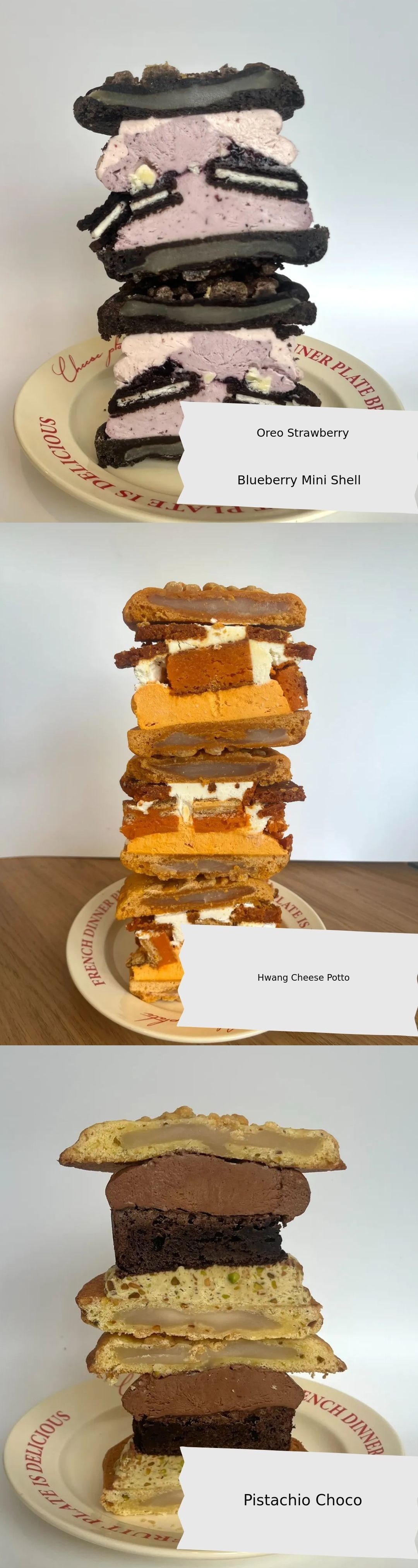 Butter (New Zealand), sugar, salt, eggs, whipping cream, flour, sweet bean paste, injeolmi powder, baking powder (Korea), cream cheese, pistachio (USA), dark chocolate (Belgium)