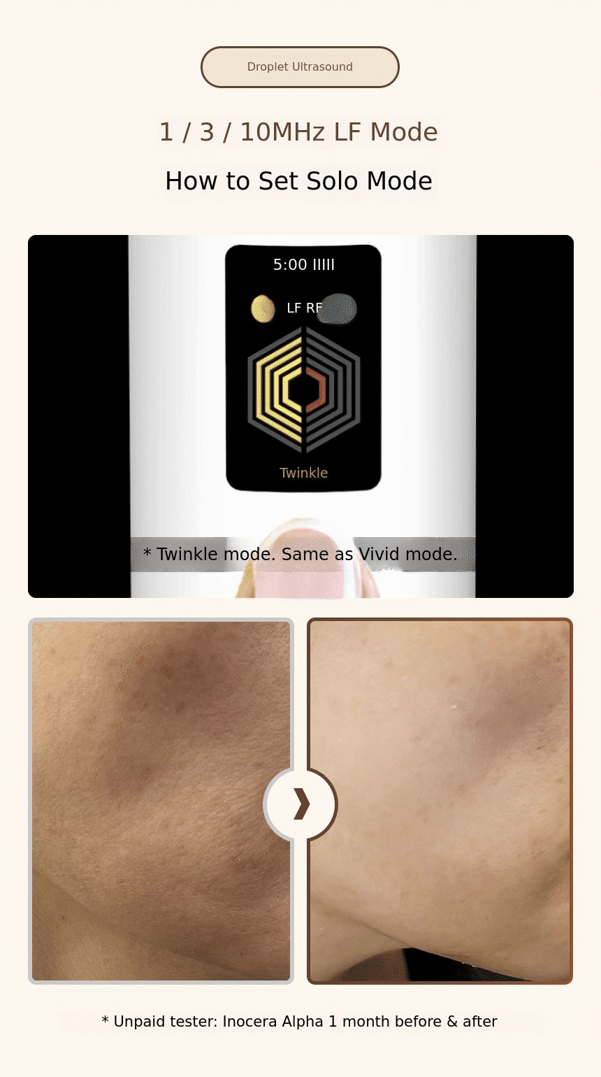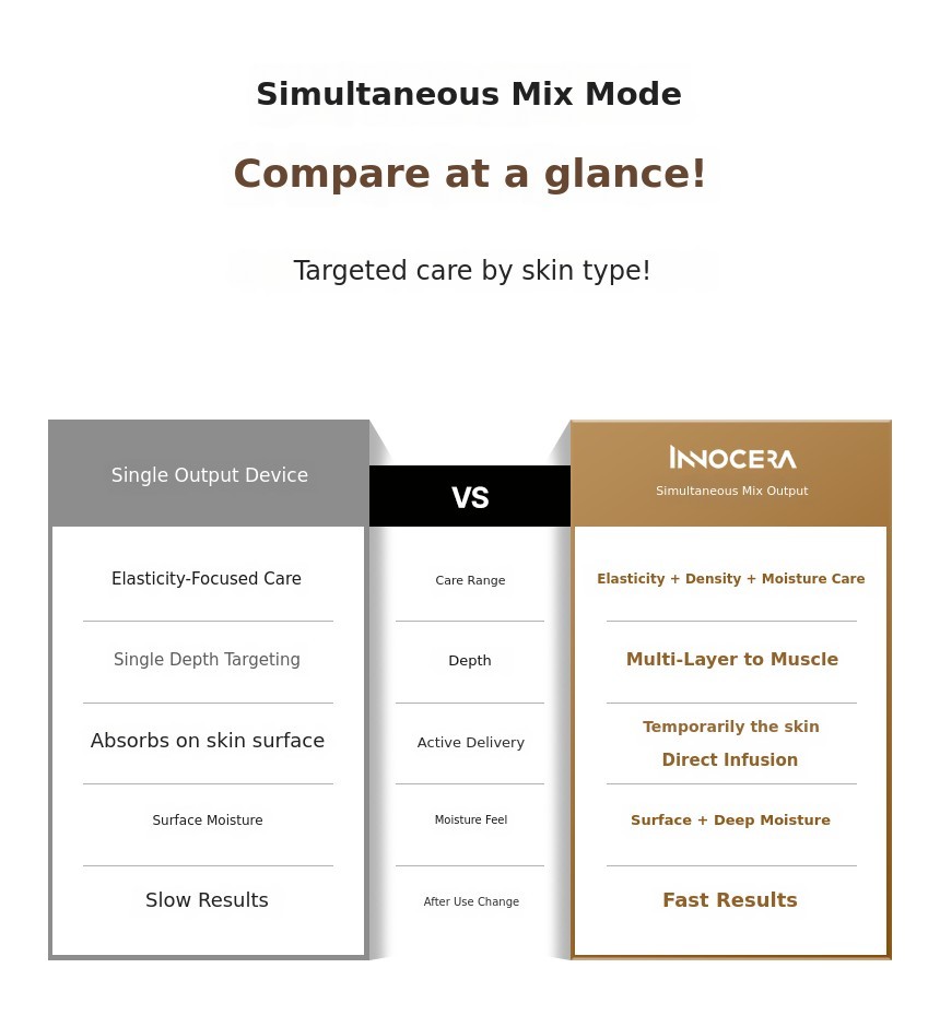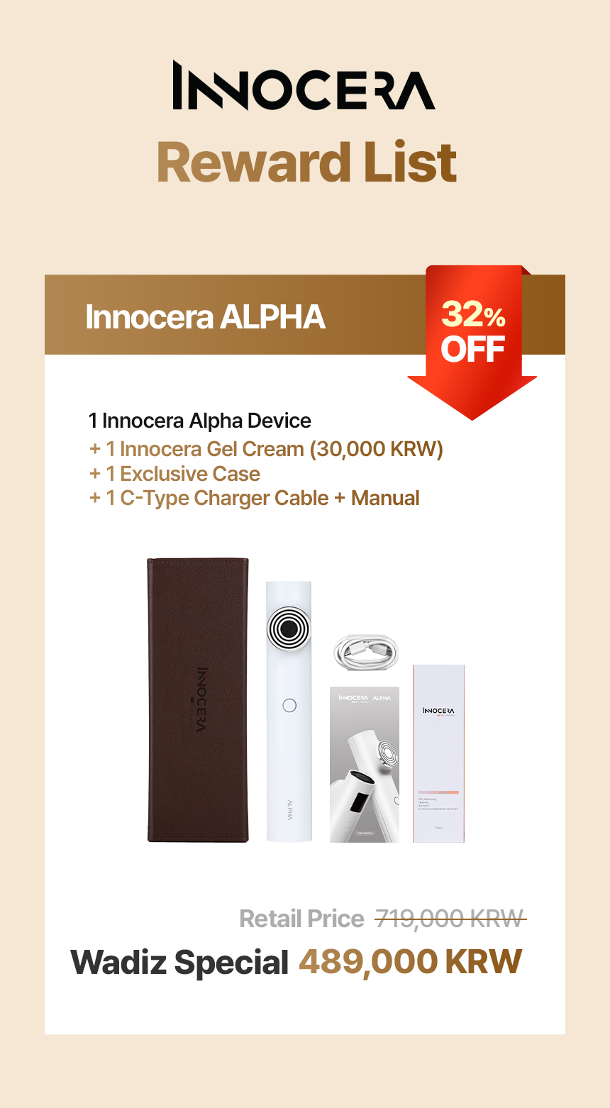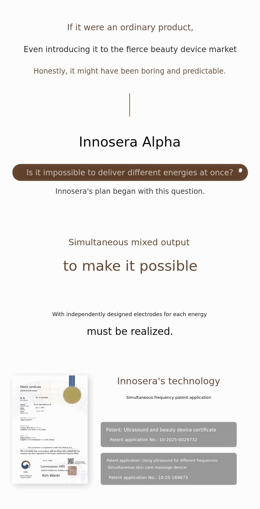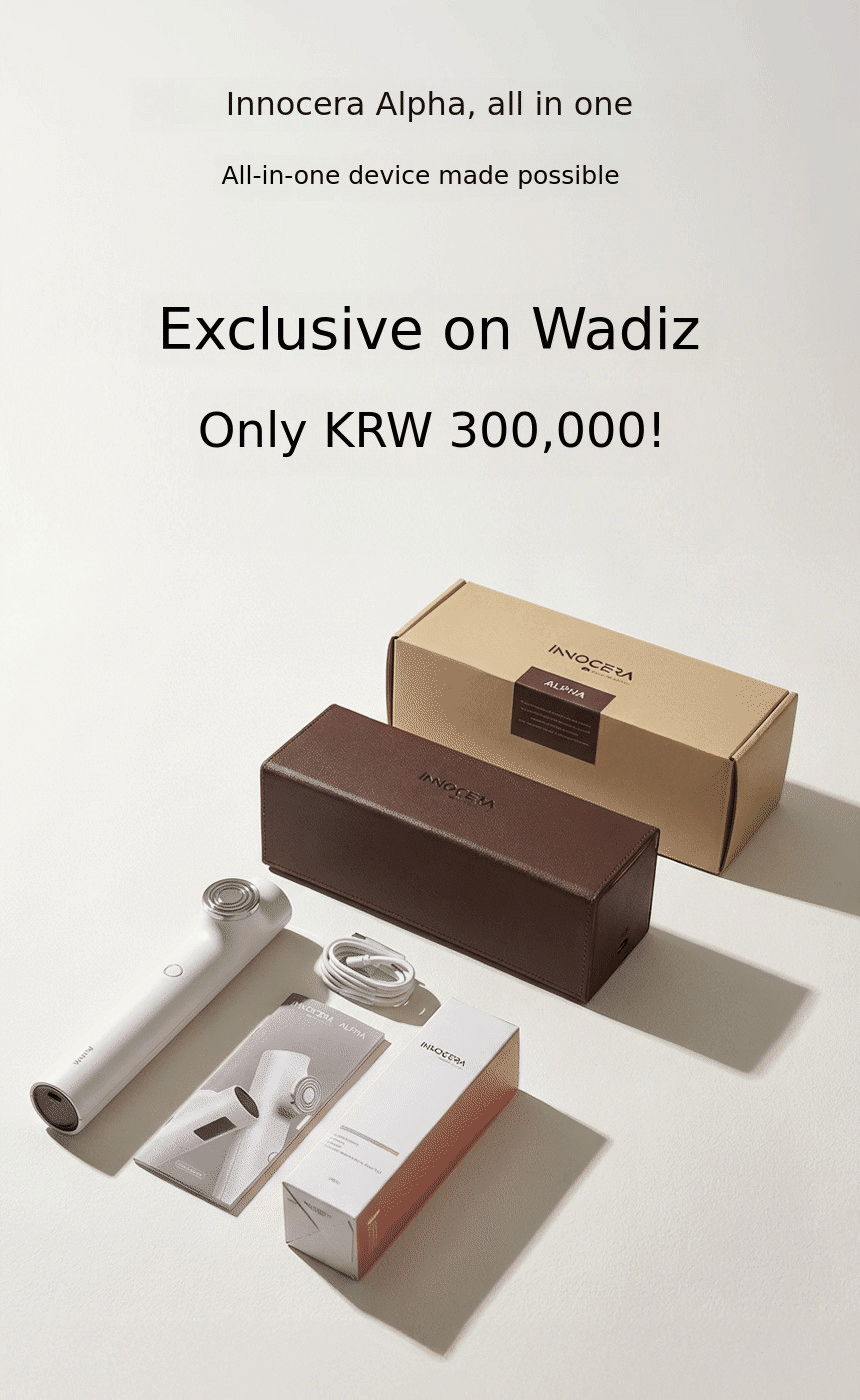 INNOCERA Alpha, introduced for the first time through Wadiz, is an innovative beauty device featuring the unprecedented 'simultaneous mixed output' technology. It combines key functions experienced in dermatology and aesthetics—droplet ultrasound, RF, MF, EP, and IR LED—into a single device, allowing simultaneous care without the need for multiple treatments. This product is designed to minimize the time busy modern people spend using beauty devices while maximizing effectiveness.