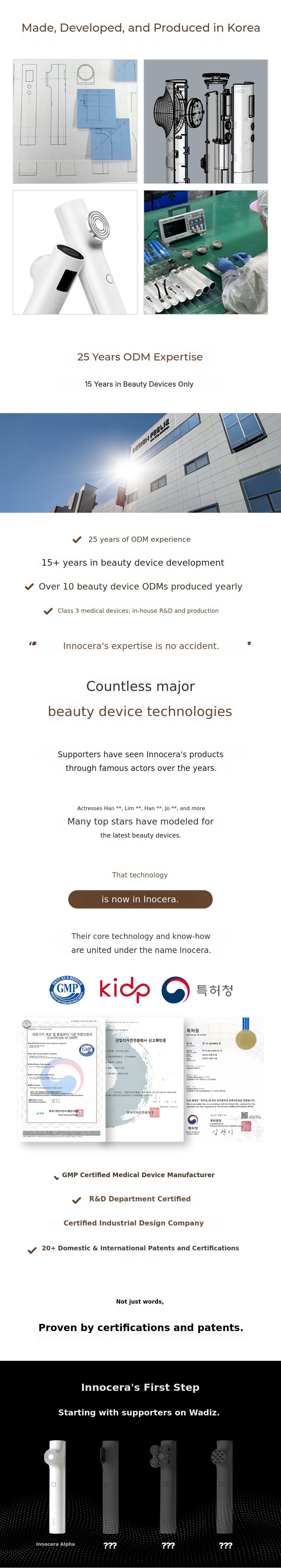 **INNOCERA** is a specialized manufacturer that has been developing and producing medical and beauty devices for 25 years. Unlike brands created in a short period, we have established differentiated competitiveness based on long-accumulated technology and manufacturing know-how. We have proven our technical capabilities by manufacturing and supplying products for many well-known beauty brands, and now, we are launching our own brand, **INNOCERA**, built on this experience and expertise.
