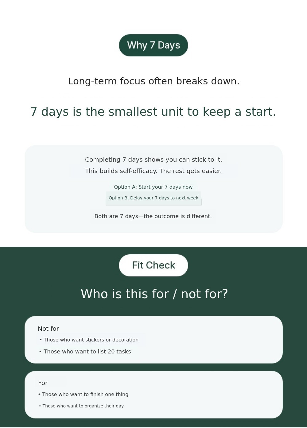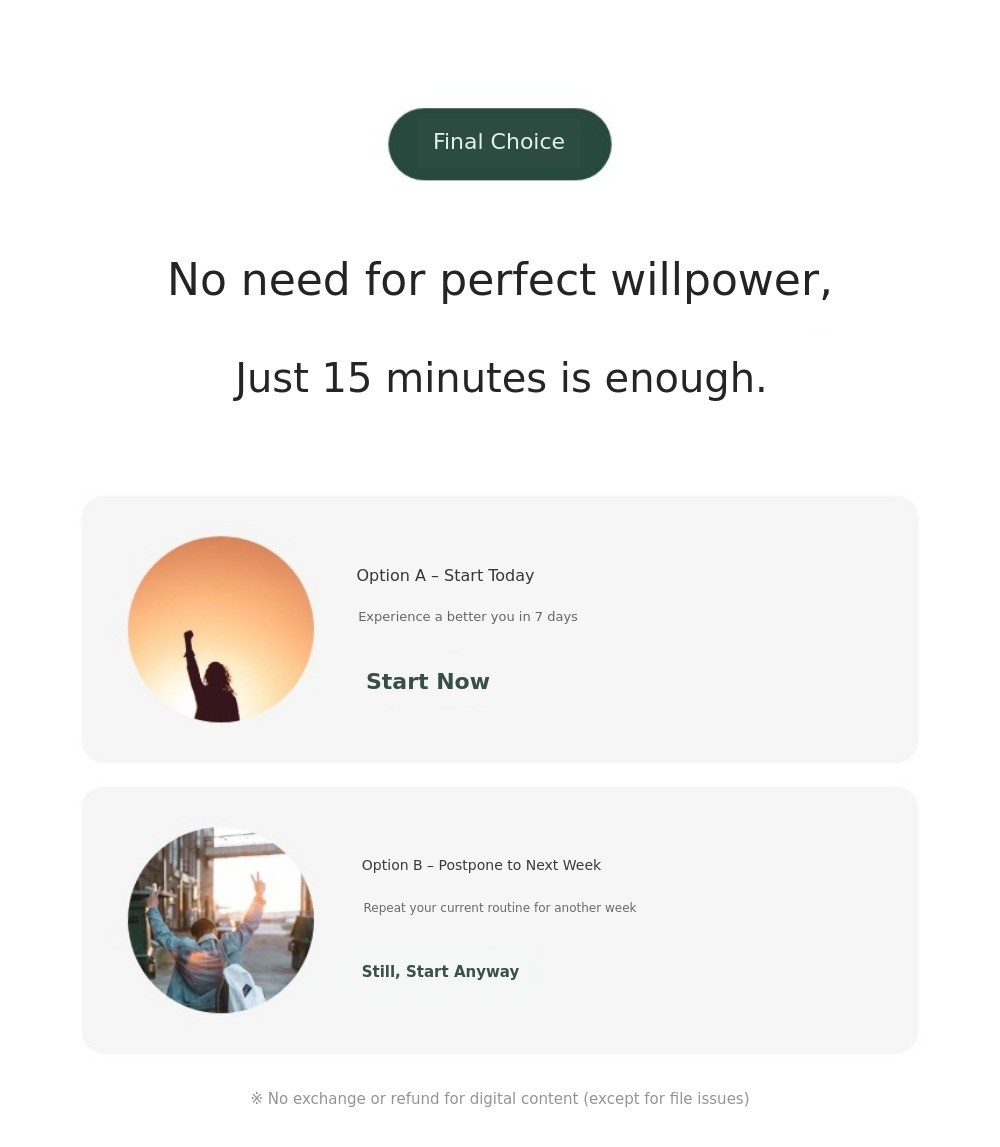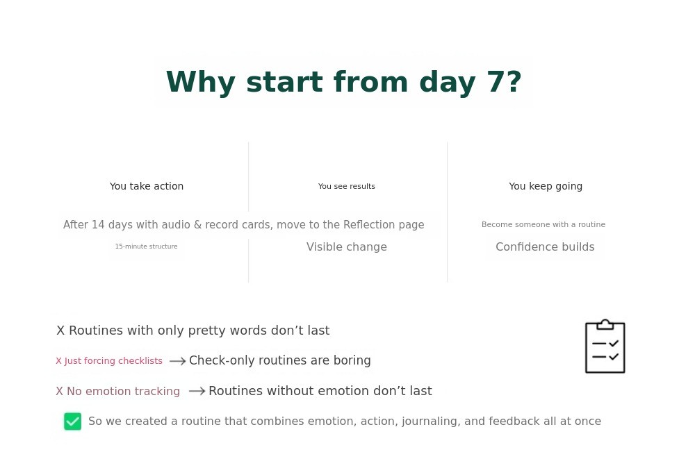 Through the 7-day/14-day challenge,you can experience ‘completion, even if short’,to restore confidence → and establish a long-term routine.