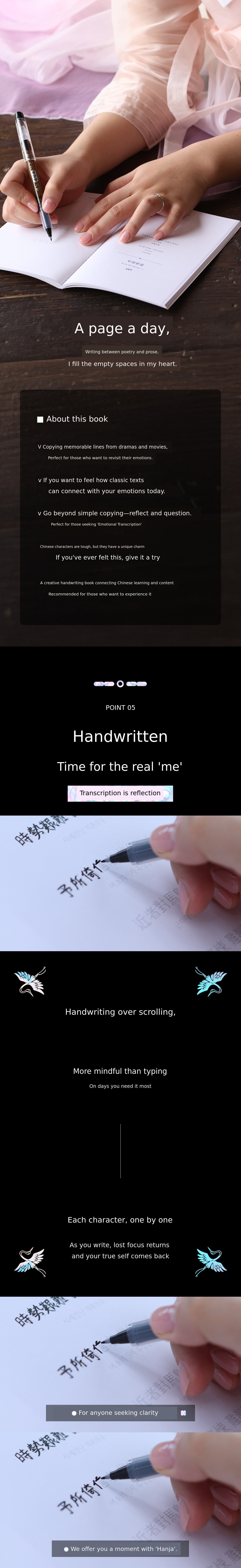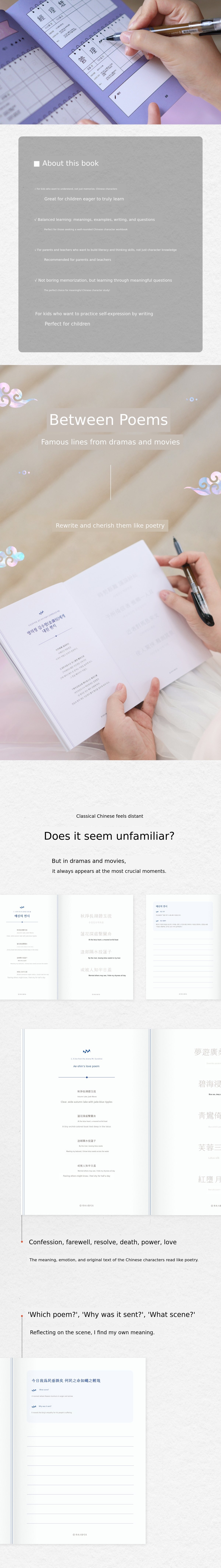 - Purpose: Copying classical Chinese phrases and poems, learning pronunciation and meaning, mindfulness routine