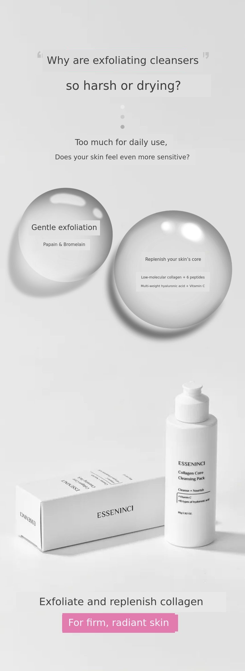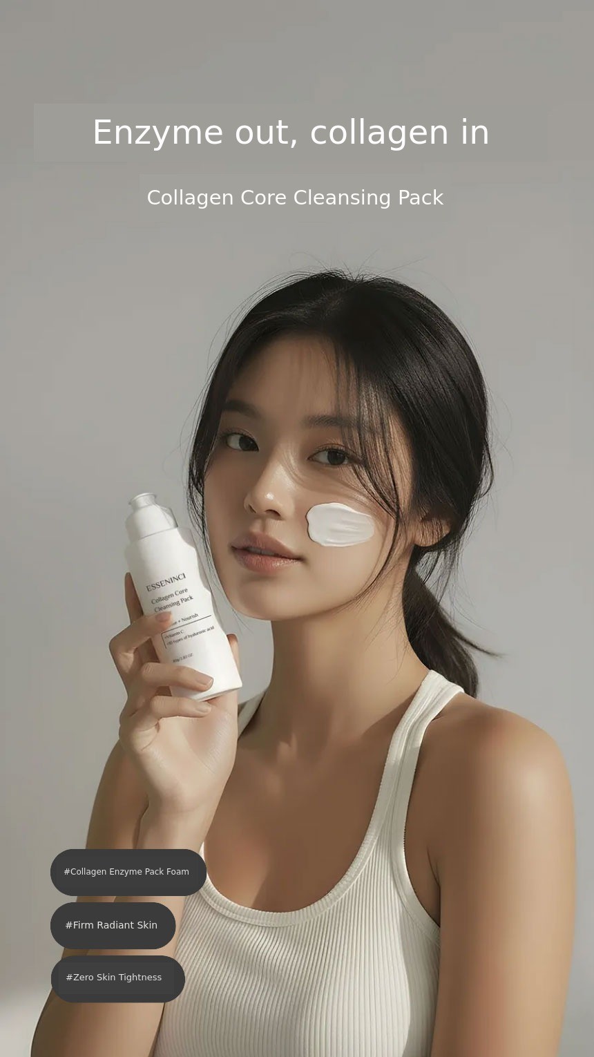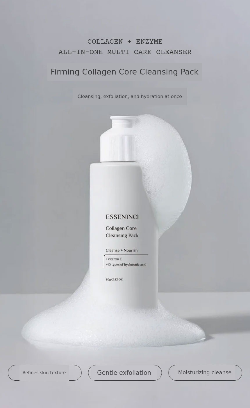 A. You can use it conveniently like a regular cleansing foam in your daily routine.When your skin needs extra care, you can use it like an enzyme mask at a skincare salon. Usually, enzyme cleansers used at salons focus only on exfoliation, but EssenNC Cleansing Pack contains collagen, peptides, hyaluronic acid, and vitamin C, so it goes beyond simple exfoliation to help with hydration, radiance, and skin texture improvement all at once.