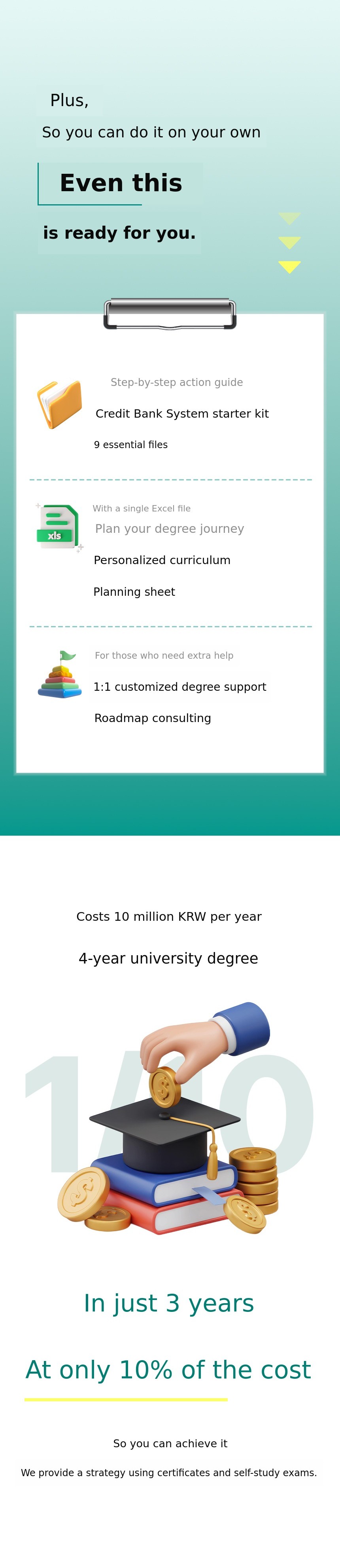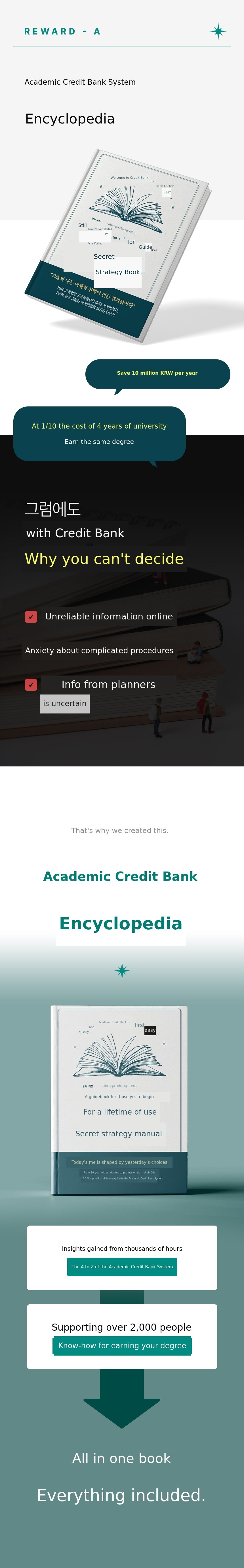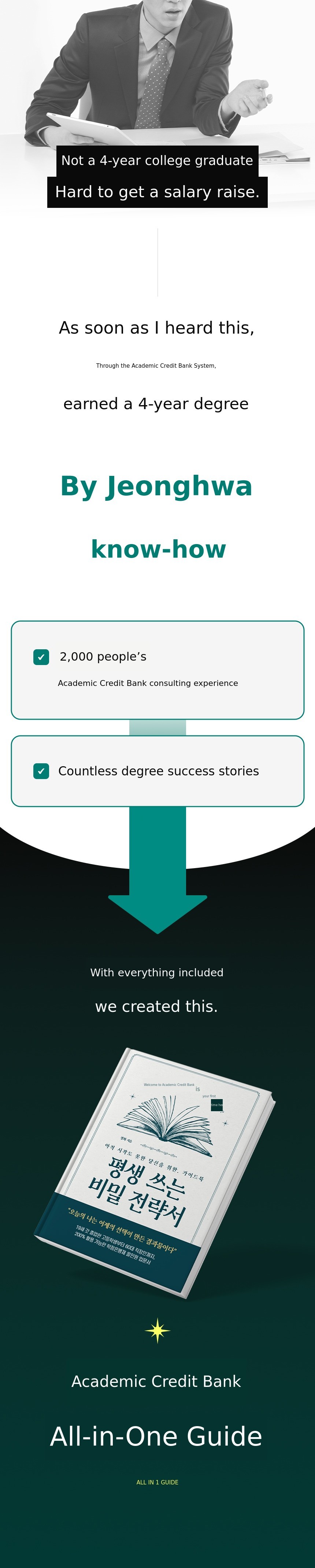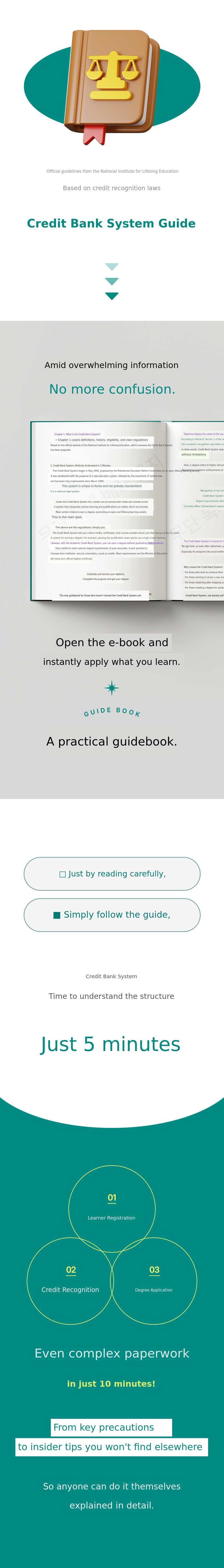 The most frequently asked question I received during countless consultations was, "Isn't there a book that gathers only accurate information?" So,I created the 'Academic Credit Bank System Encyclopedia,' which contains all the know-how I gained from consulting 2,000 people and spending thousands of hours. My goal is not just to list information, but to explain why the Academic Credit Bank System is necessary, how to utilize it, and to help you design your own future.