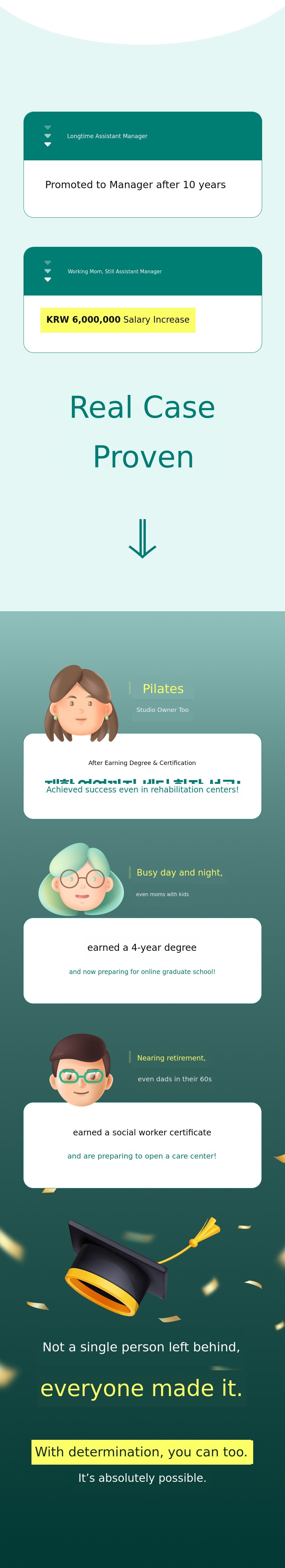 After leaving the company, my older brother, who was angry with me about my situation, looked into the Academic Credit Bank System and introduced me to it. However, the information online was too vast and unclear. I was scared, thinking, 'Can I really do something this complicated on my own?' I even tried contacting an Academic Credit Bank System planner, but couldn't get through. I didn't give up and searched for information in various ways, such as the National Institute for Lifelong Education and the Self-Education Degree System websites. In the end, by chance, I got a job at an Academic Credit Bank System educational institution, which allowed me to fully understand the system. During that process, I earned my own degree and met over 2,000 students with various cases. From seniors in their 60s to working moms raising twins, and shift workers, I saw everyone successfully obtain their degrees and became convinced. 'If you just know the right method, anyone can do it.'
