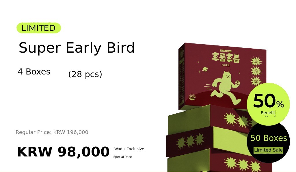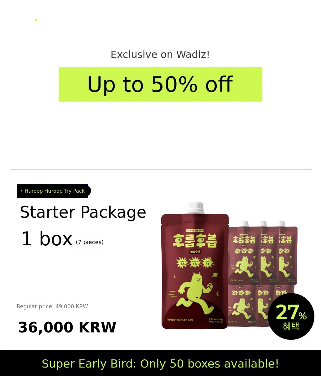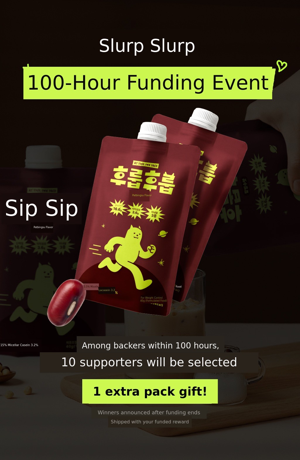 1. 🥤 Casein Protein Shake - Provides 6-hour lasting fullness with casein protein 2. 🍫 Rich Flavor and Nutrition - Contains palbingsoo flavor, high protein, fiber, and minerals 3. 🎁 1+1 Bonus Event - 1300% funded on Wadiz with special bonus offer