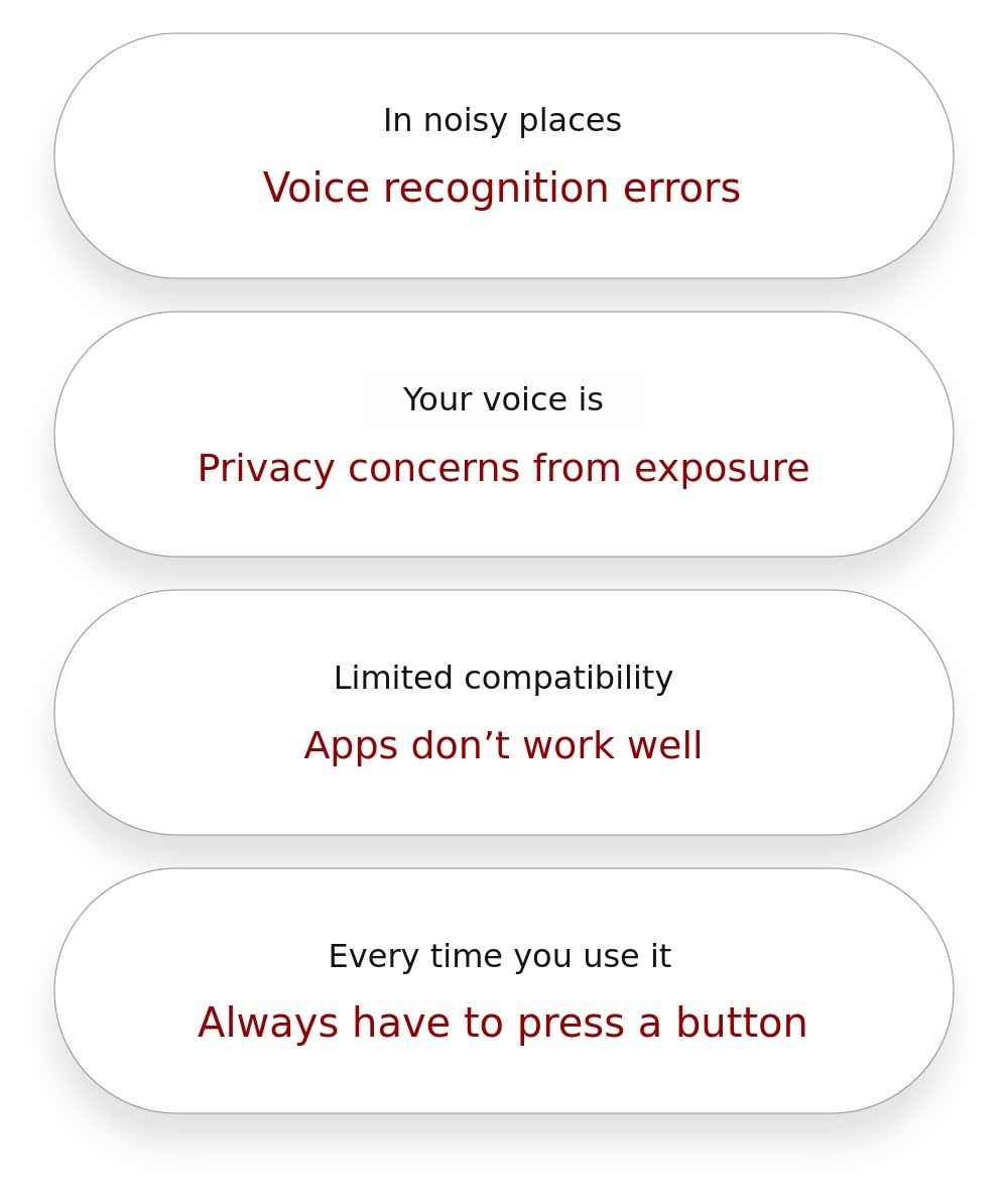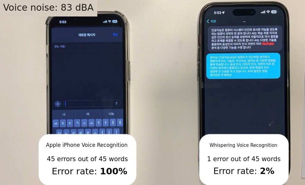 Wizpering has accurately addressed the frequent misrecognitions that other companies ultimately failed to solve.It does not recognize any surrounding noise or other people's voices. Without the need to speak loudly, it fully recognizes only the user's whisper.