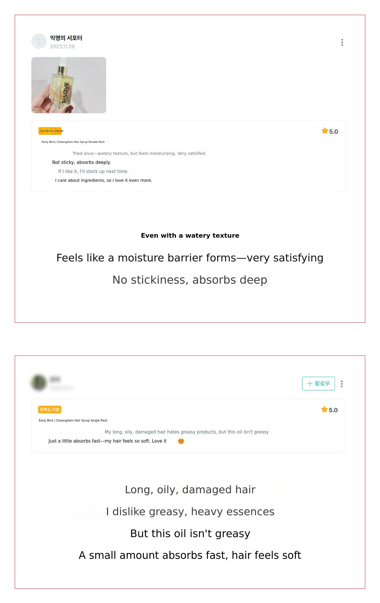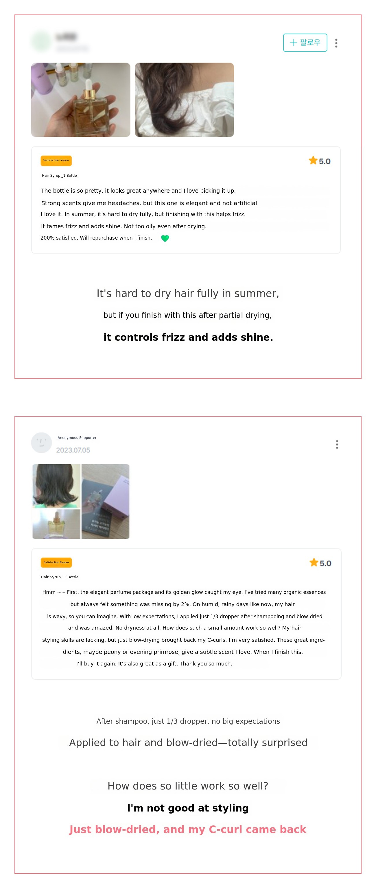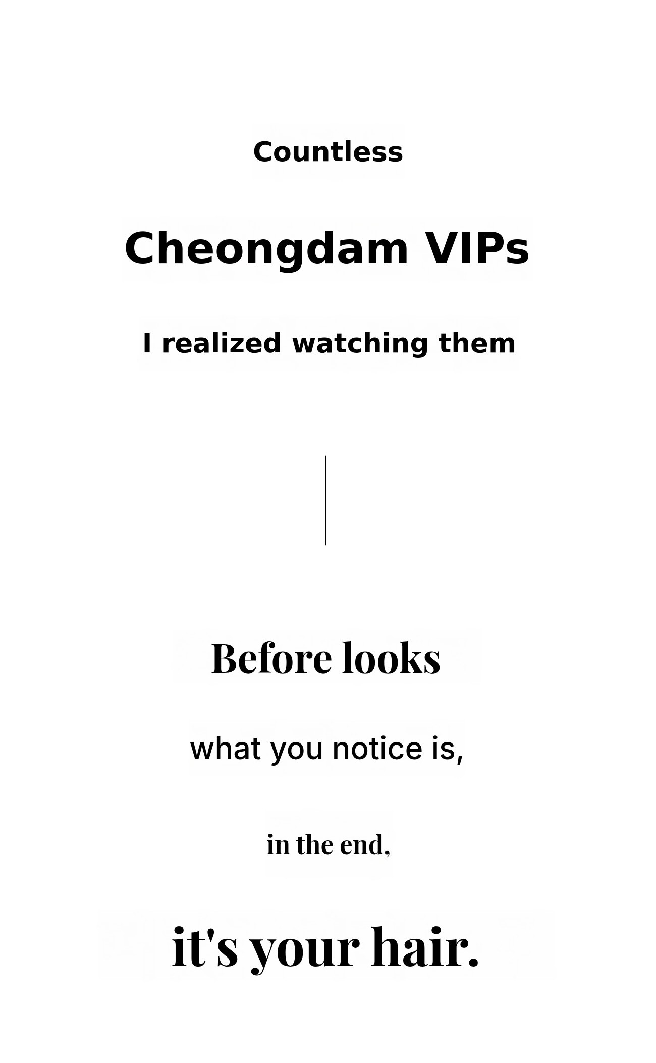 We're not professionals anyway,On busy mornings, applying all sorts of products,Ends up making you wash your hair twice unexpectedly. Without that, just apply Cheongdam-dong Hair Syrup and style. Try it. You'll feel more relaxed, and your hair will look even more VVIP.