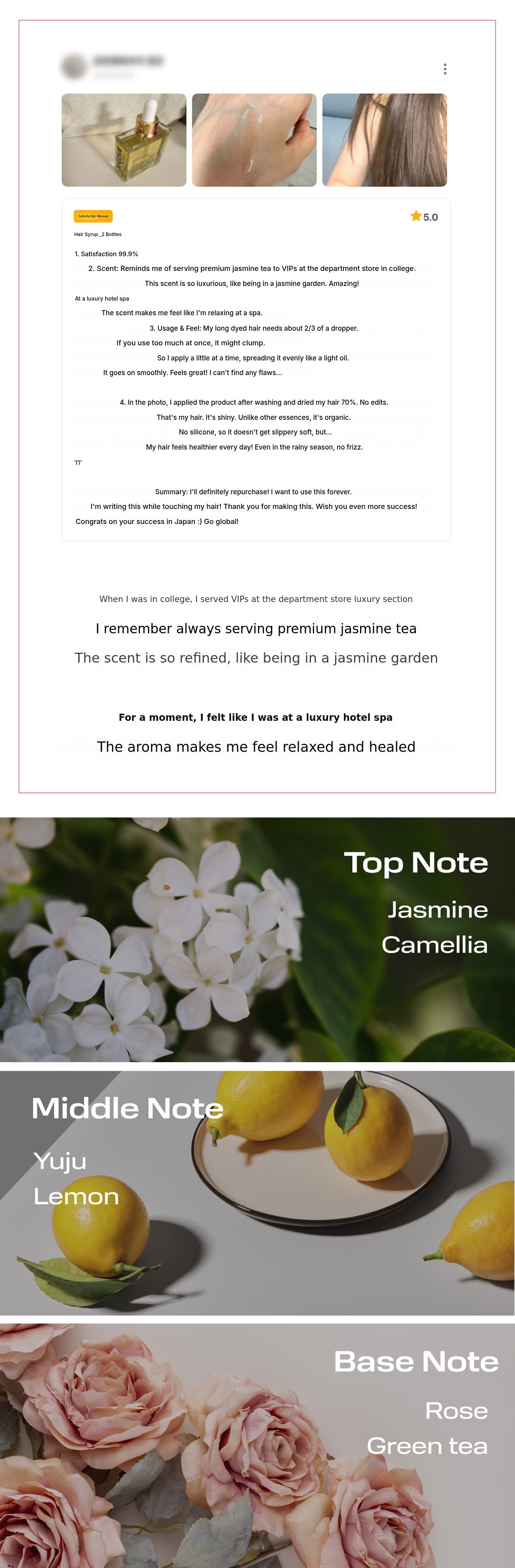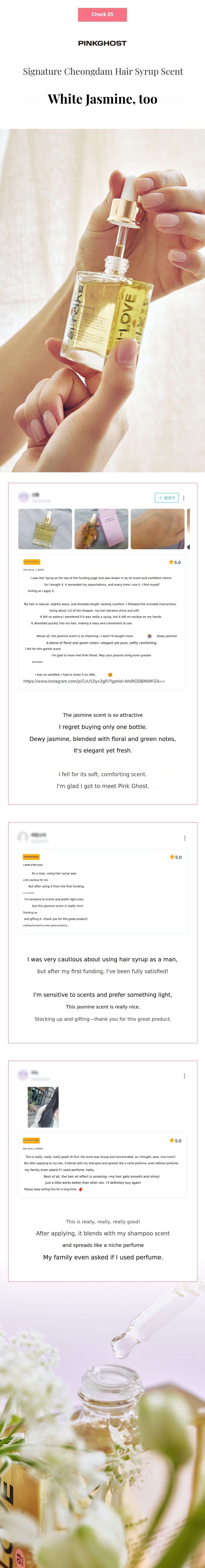 The jasmine scent of Cheongdam-dong Hair Syrup smells like a drop of rose added to white jasmine.Like a perfume, the natural fragrance unfolds in top, middle, and base notes.It even makes passersby turn their heads.
