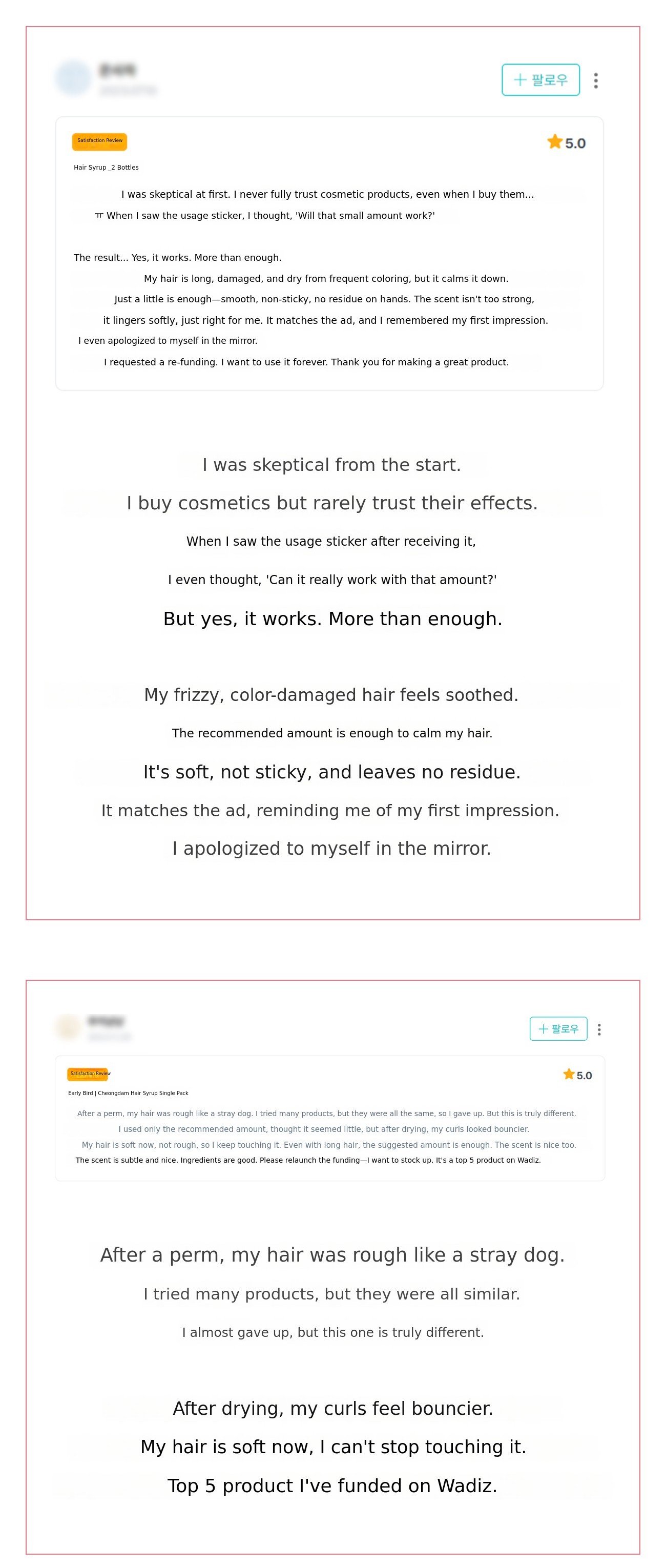 We made our debut, took our first step, and that first step reached Japan. We don't know where our journey will lead us next, but Pink Ghost's Hair Syrup will definitely be introduced on Wadiz as a new product with great benefits.